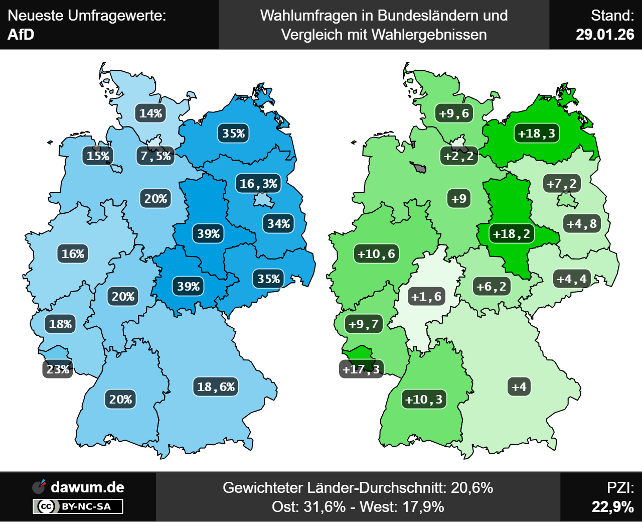 Im neuesten Wahltrend zur Bundestagswahl hat die AfD aktuell 25,6%. In den Bundesländern kommt die AfD im nach Einwohnern gewichteten Durchschnitt zu den Landtagswahlen auf 20,8%, wobei er in den alten Bundesländern 18,1% und in den neuen Bundesländern (mit Berlin) 32,1% beträgt. Ihre höchsten aktuellen Umfragewerte erreicht die AfD in den Bundesländern Sachsen-Anhalt (40%), Thüringen (39%) sowie Mecklenburg-Vorpommern (38%). Demgegenüber erreicht die AfD im Bundesland Hamburg (7,5%) ihren niedrigsten aktuellen Umfragewert. Der Parteizustimmungsindex (PZI) von der AfD beträgt aktuell 23,2%.