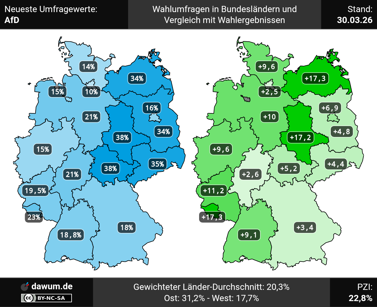 Im neuesten Wahltrend zur Bundestagswahl hat die AfD aktuell 24%. In den Bundesländern kommt die AfD im nach Einwohnern gewichteten Durchschnitt zu den Landtagswahlen auf 20,3%, wobei er in den alten Bundesländern 17,5% und in den neuen Bundesländern (mit Berlin) 31,8% beträgt. Ihre höchsten aktuellen Umfragewerte erreicht die AfD in den Bundesländern Sachsen-Anhalt (39%), Thüringen (38%) sowie Mecklenburg-Vorpommern (37%). Demgegenüber erreicht die AfD im Bundesland Hamburg (7,5%) ihren niedrigsten aktuellen Umfragewert. Der Parteizustimmungsindex (PZI) von der AfD beträgt aktuell 22,1%.