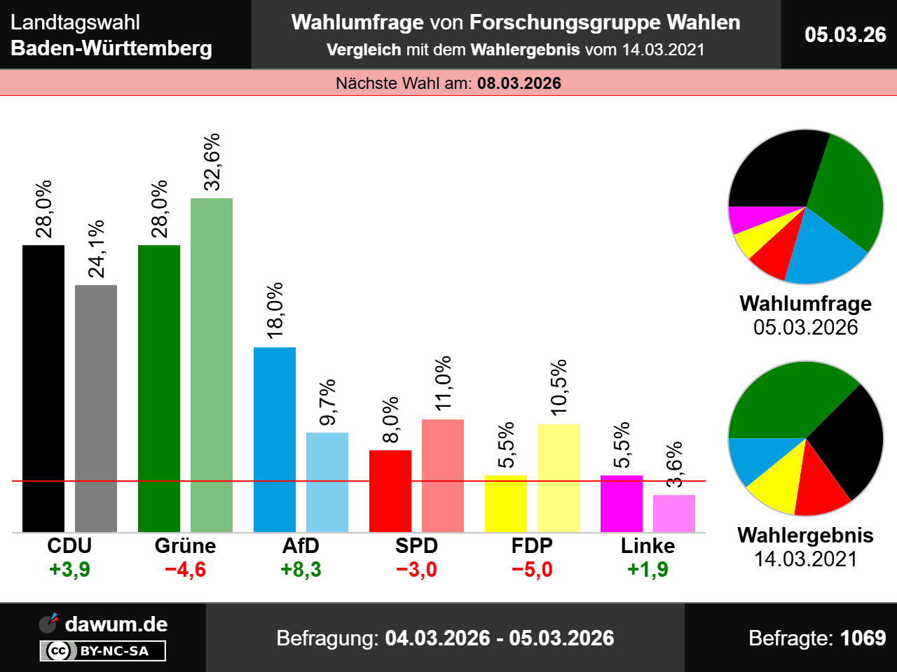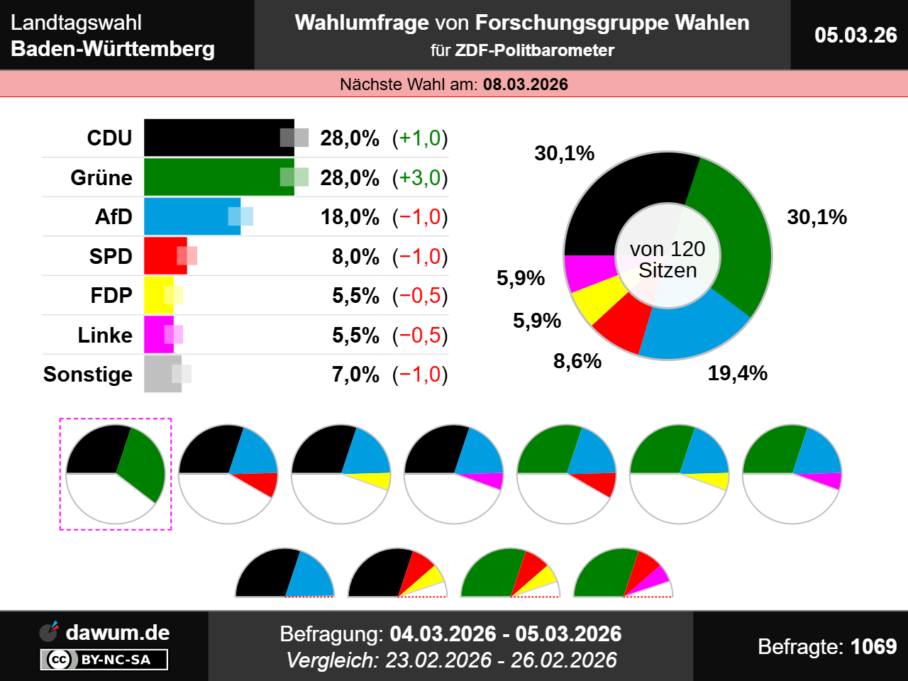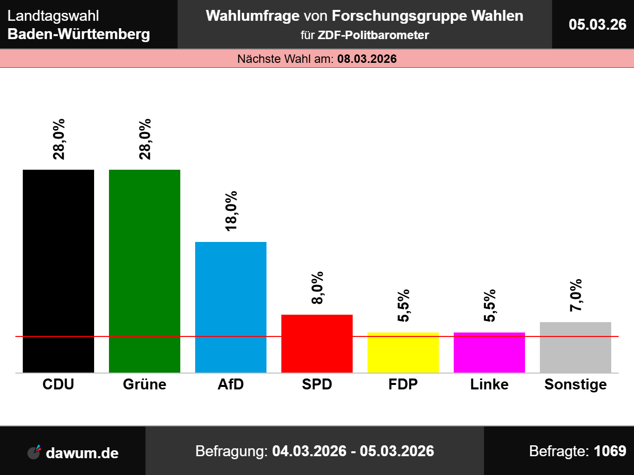 Diese Wahlumfrage (Sonntagsfrage) zur Landtagswahl in Baden-Württemberg wurde von Forschungsgruppe Wahlen im Auftrag von ZDF-Politbarometer durchgeführt und am 05.03.2026 insbesondere bei zdfheute.de veröffentlicht. Die Mixed-Befragung (telefonisch und online) fand zwischen dem 04.03.2026 und dem 05.03.2026 bei 1069 Wahlberechtigten statt.