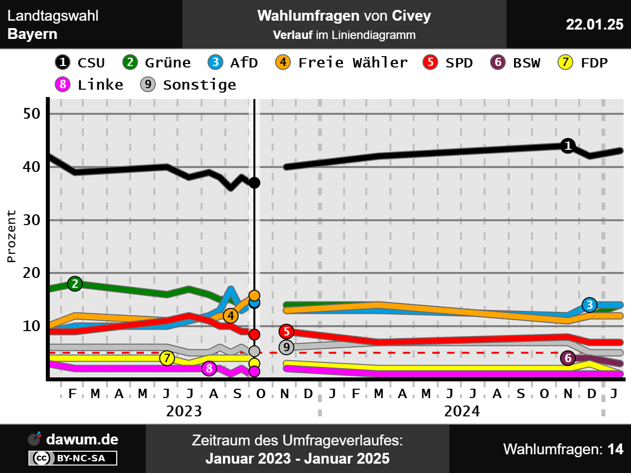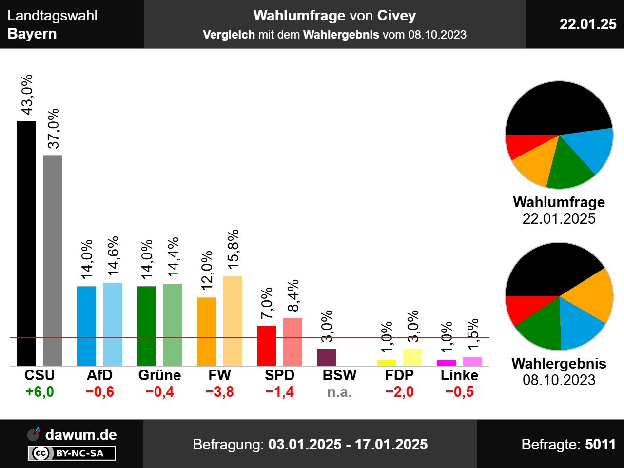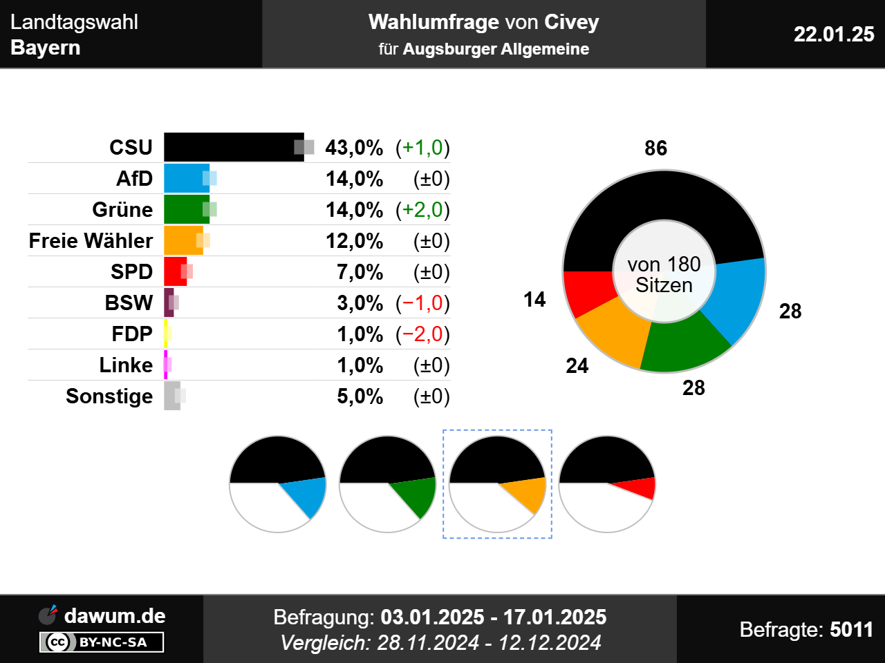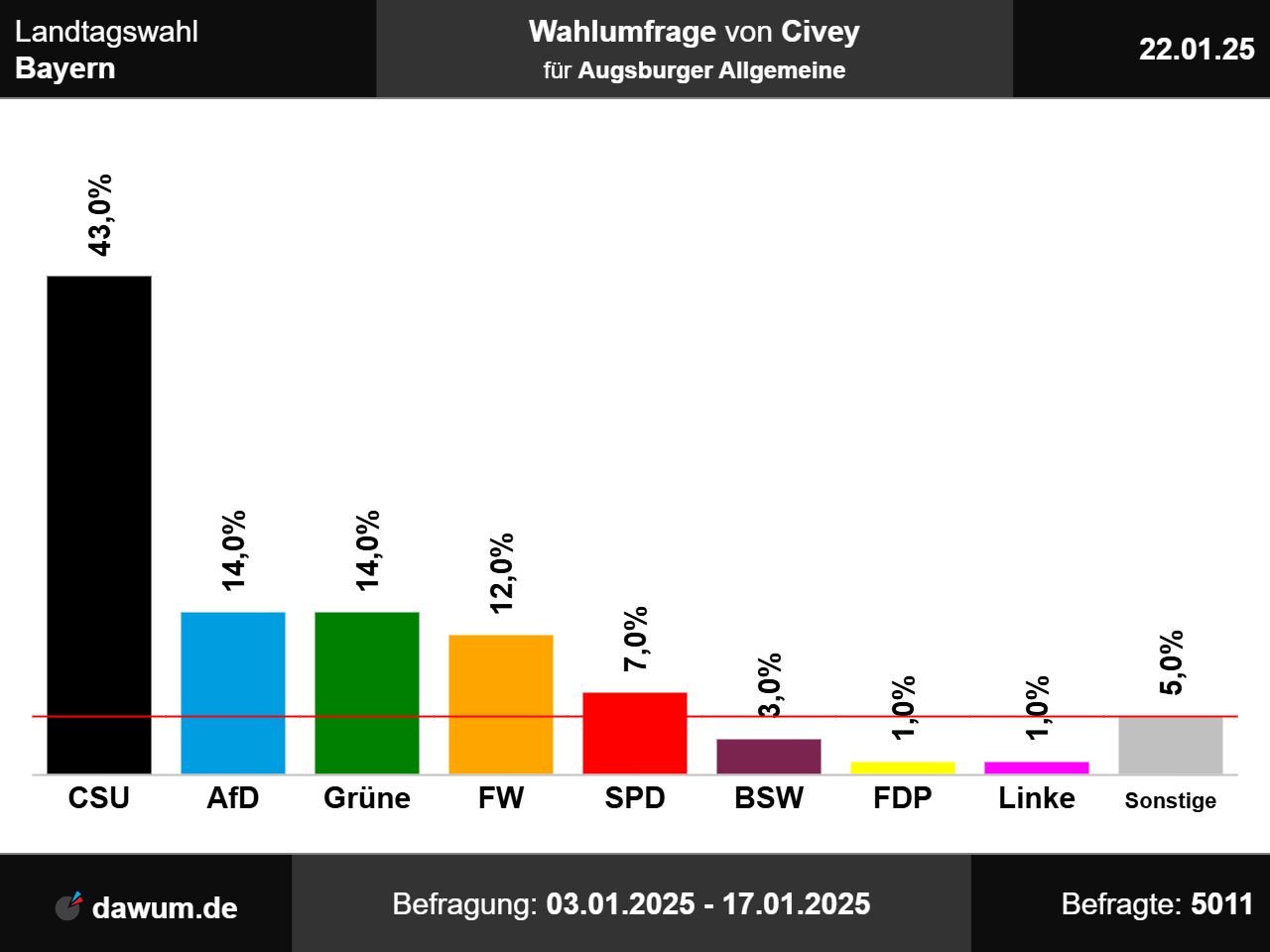 Diese Wahlumfrage (Sonntagsfrage) zur Landtagswahl in Bayern wurde von Civey im Auftrag von Augsburger Allgemeine durchgeführt und am 22.01.2025 insbesondere bei augsburger-allgemeine.de veröffentlicht. Die Online-Befragung fand zwischen dem 03.01.2025 und dem 17.01.2025 bei 5011 Wahlberechtigten statt.