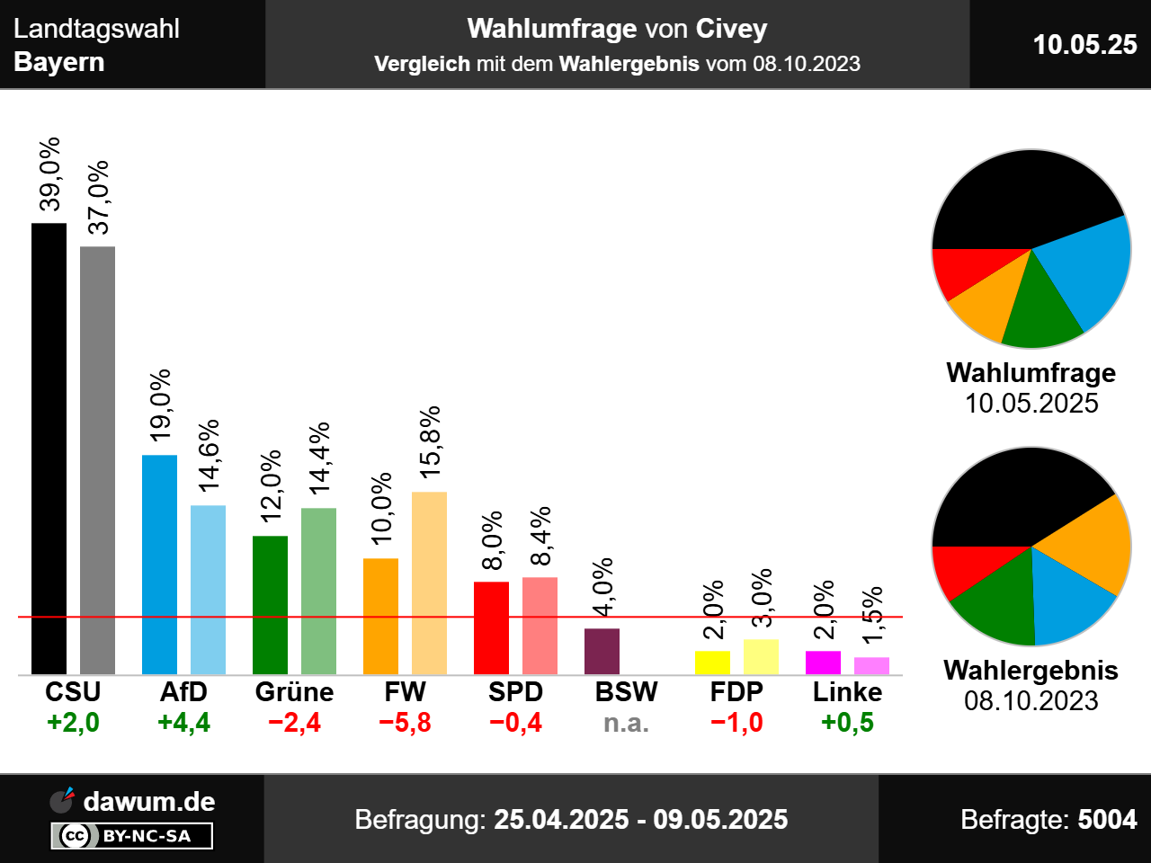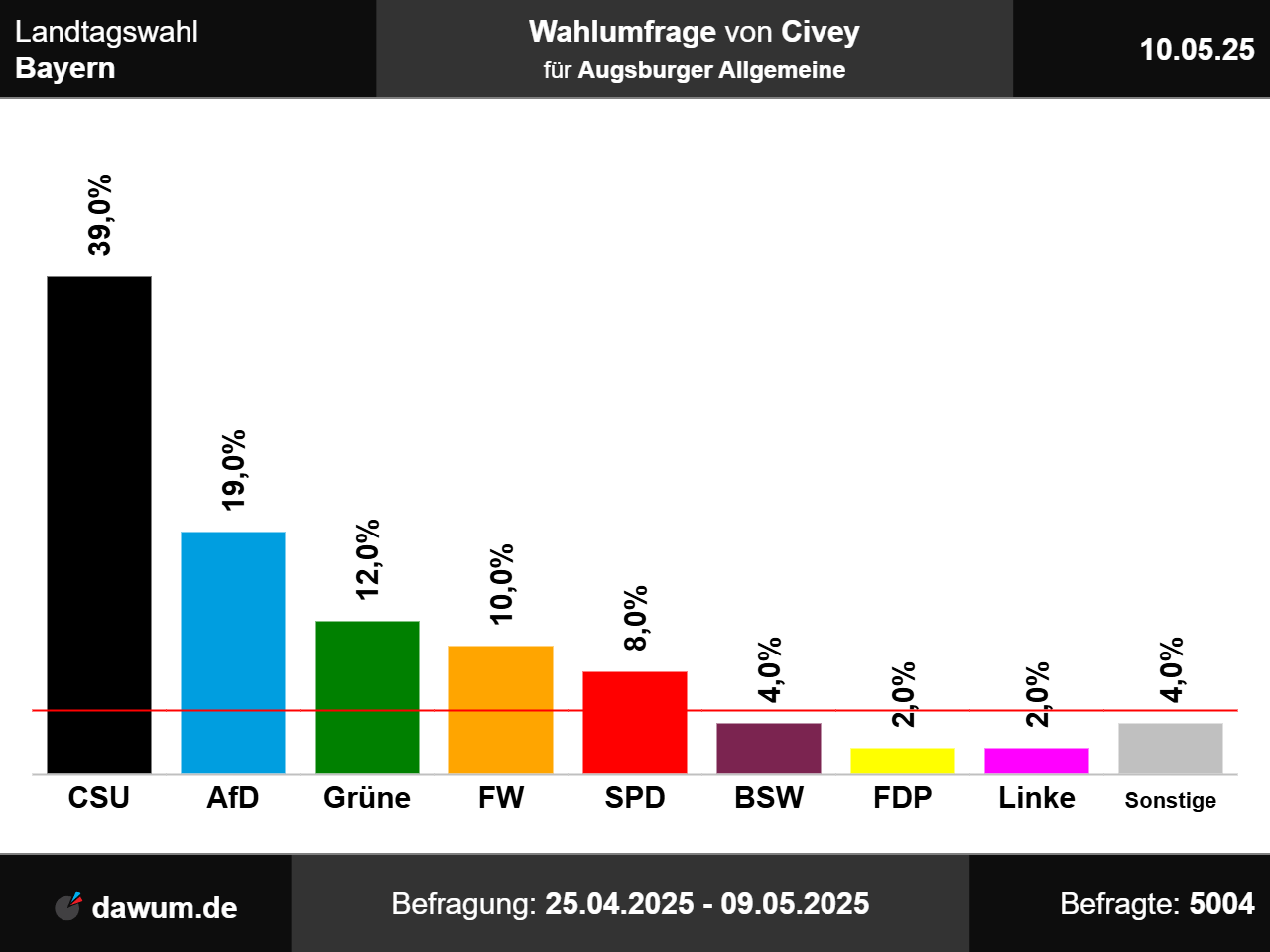 Nach dieser Wahlumfrage würden die CSU 39%, die AfD 19%, Bündnis 90/Die Grünen 12%, die Freien Wähler 10%, die SPD 8%, das Bündnis Sahra Wagenknecht und die sonstigen Parteien jeweils 4% sowie die FDP und Die Linke jeweils 2% erhalten. Im Vergleich zur vorherigen Wahlumfrage vom 12.04.2025 gewinnt die AfD 1 Prozentpunkt(e) hinzu, während die sonstigen Parteien 1 Prozentpunkt(e) verliert. Sofern eine Partei zuvor nicht aufgeführt wurde, wird beim Vergleich n.a. angezeigt.