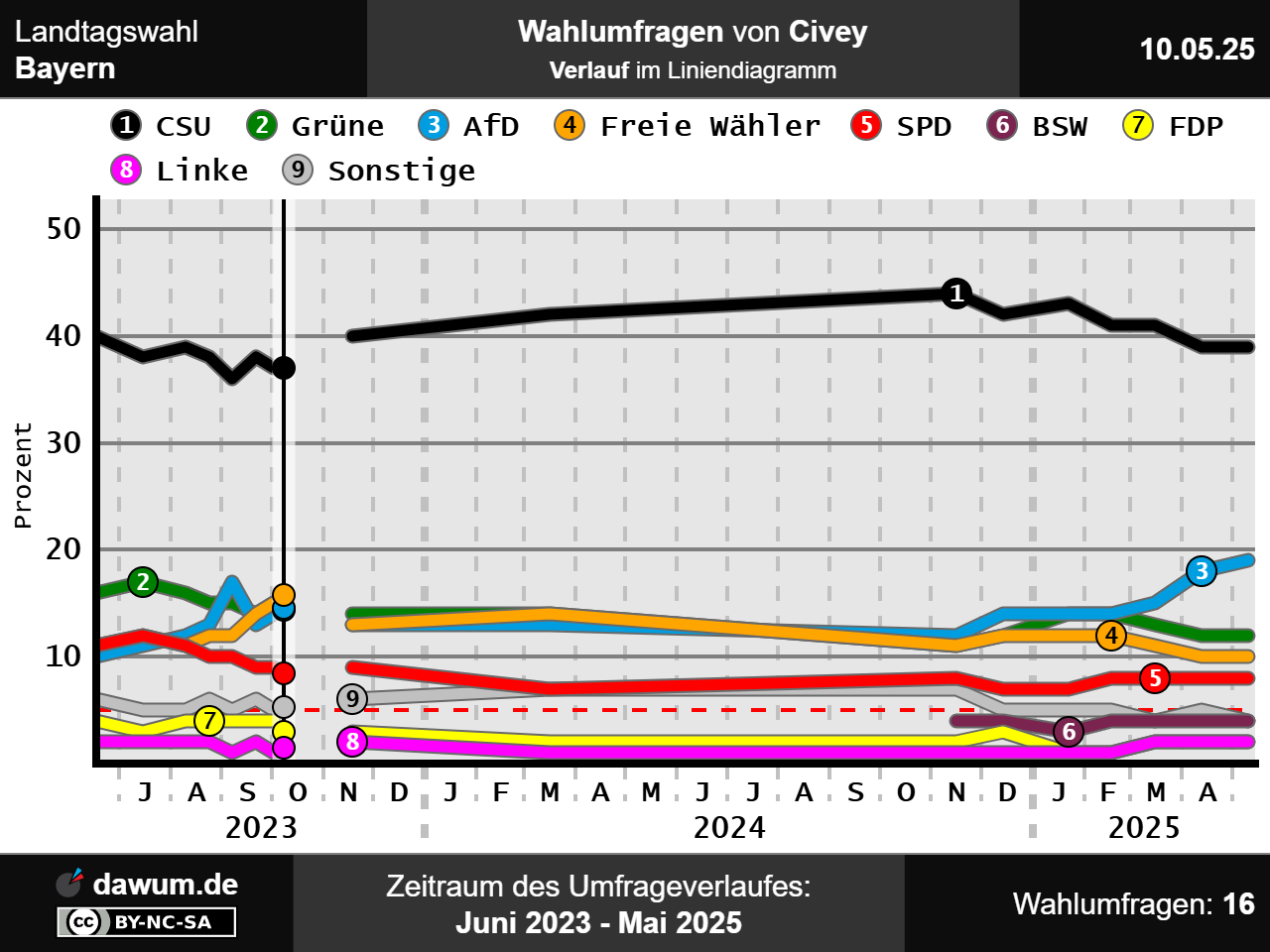 Diese Wahlumfrage (Sonntagsfrage) zur Landtagswahl in Bayern wurde von Civey im Auftrag von Augsburger Allgemeine durchgeführt und am 10.05.2025 insbesondere bei augsburger-allgemeine.de veröffentlicht. Die Online-Befragung fand zwischen dem 25.04.2025 und dem 09.05.2025 bei 5004 Wahlberechtigten statt.