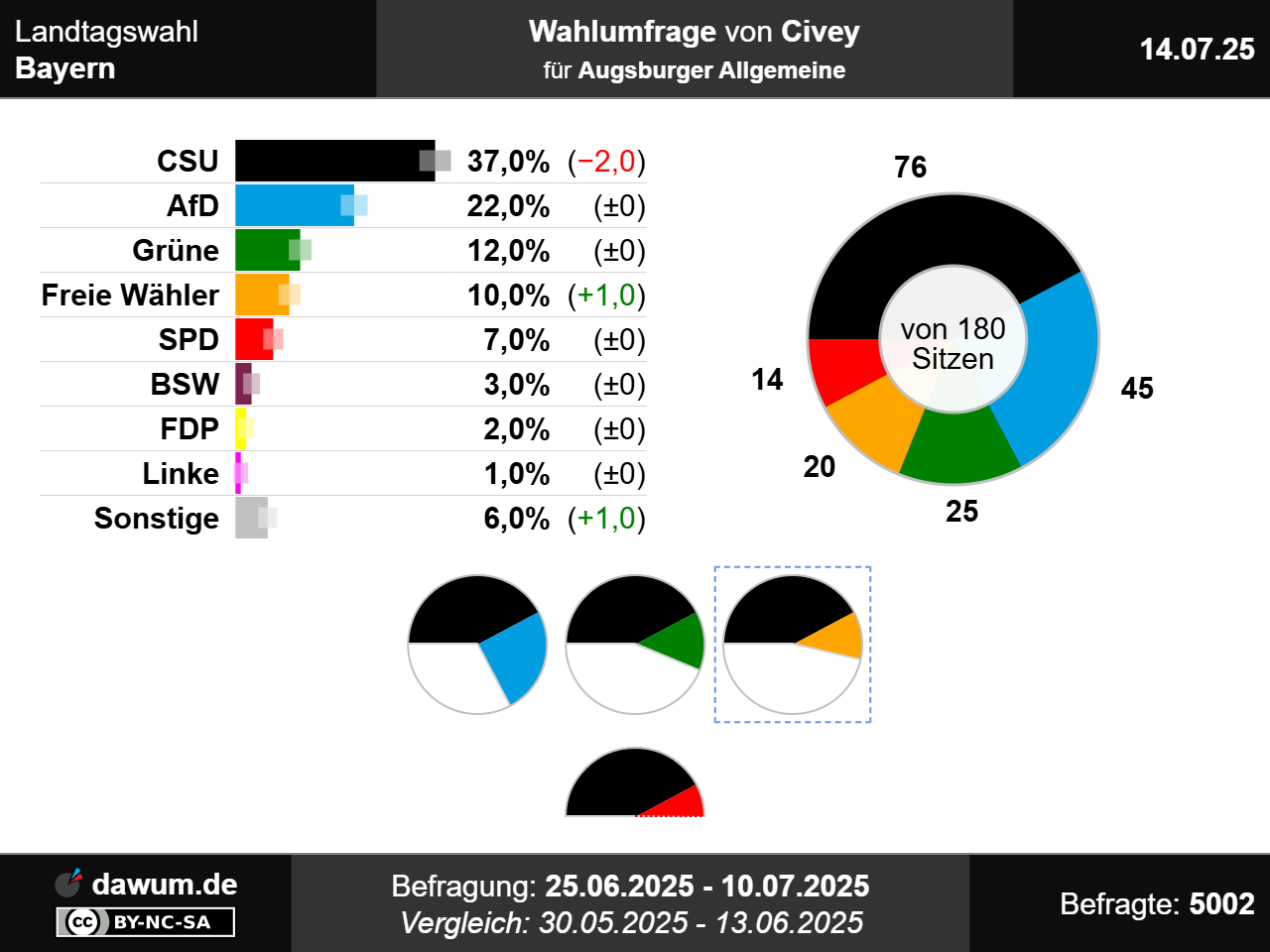 Nach dieser Wahlumfrage würden die CSU 37%, die AfD 22%, Bündnis 90/Die Grünen 12%, die Freien Wähler 10%, die SPD 7%, die sonstigen Parteien 6%, das Bündnis Sahra Wagenknecht 3%, die FDP 2% sowie Die Linke 1% erhalten. Im Vergleich zur vorherigen Wahlumfrage vom 14.06.2025 gewinnen die Freien Wähler und die sonstigen Parteien jeweils 1 Prozentpunkt(e) hinzu, während die CSU 2 Prozentpunkt(e) verliert. Sofern eine Partei zuvor nicht aufgeführt wurde, wird beim Vergleich n.a. angezeigt.