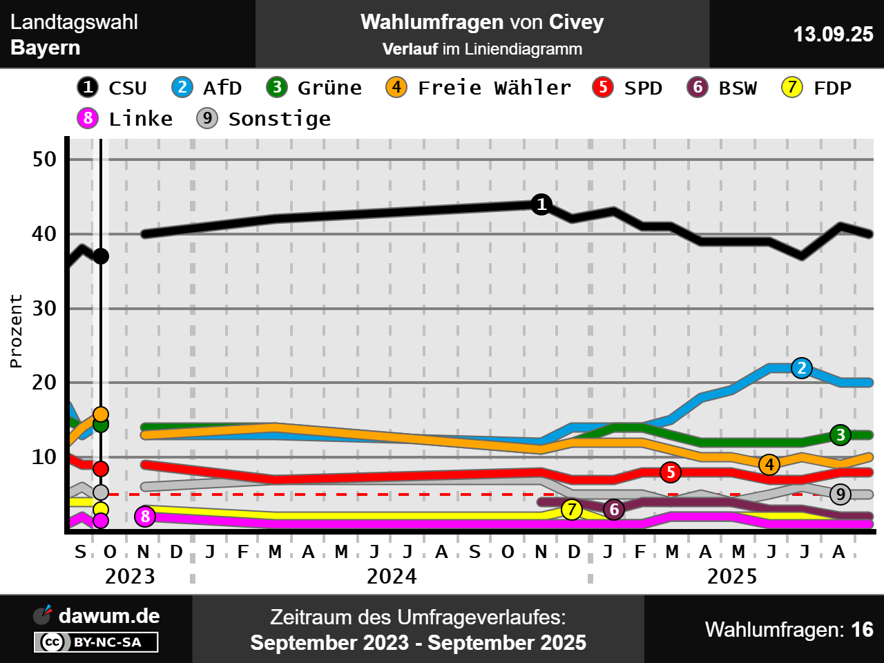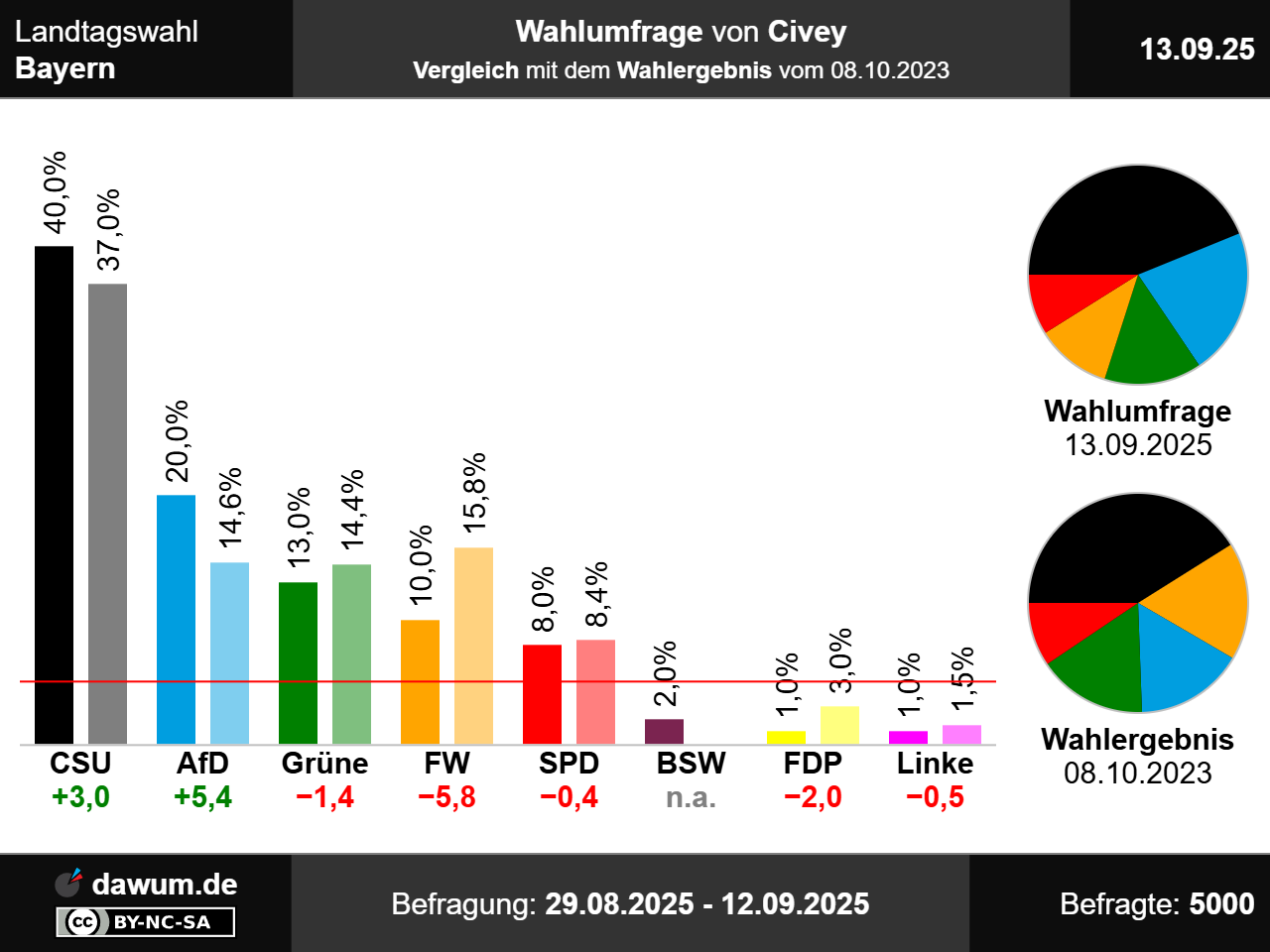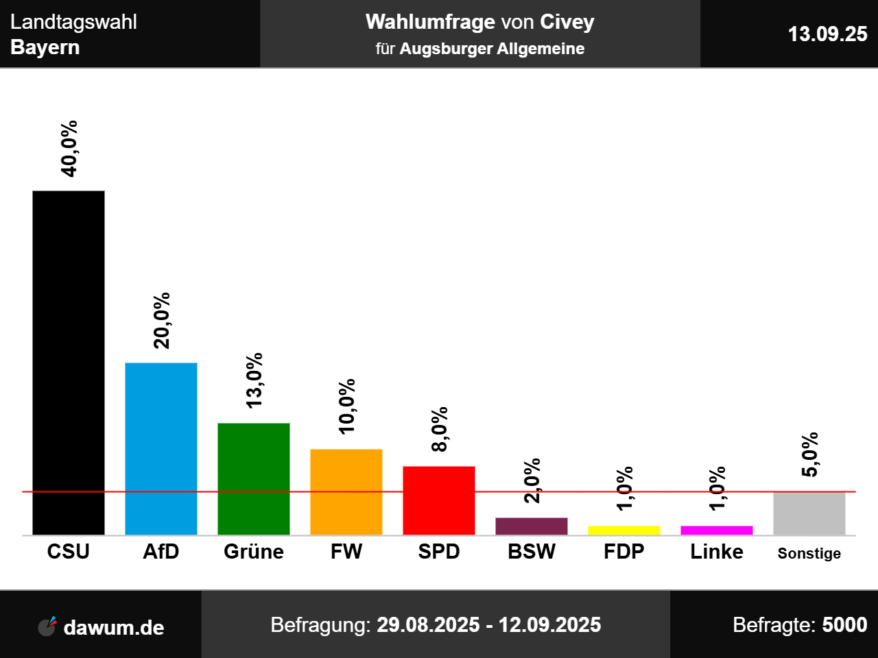 Diese Wahlumfrage (Sonntagsfrage) zur Landtagswahl in Bayern wurde von Civey im Auftrag von Augsburger Allgemeine durchgeführt und am 13.09.2025 insbesondere bei augsburger-allgemeine.de veröffentlicht. Die Online-Befragung fand zwischen dem 29.08.2025 und dem 12.09.2025 bei 5000 Wahlberechtigten statt.