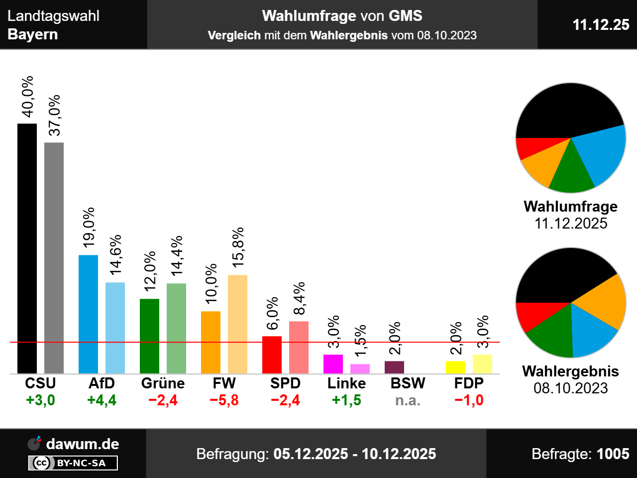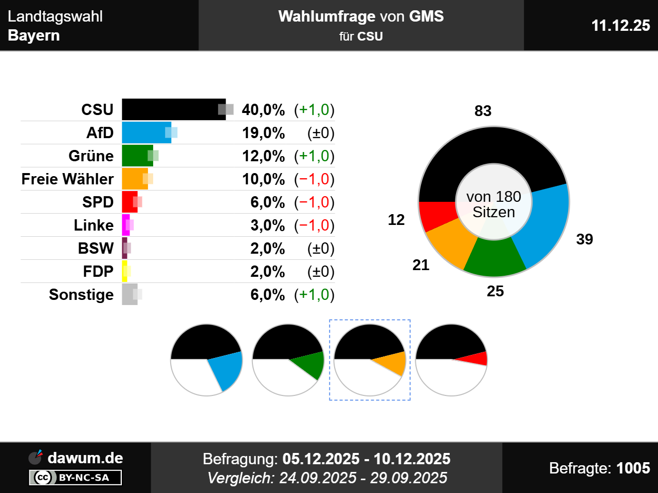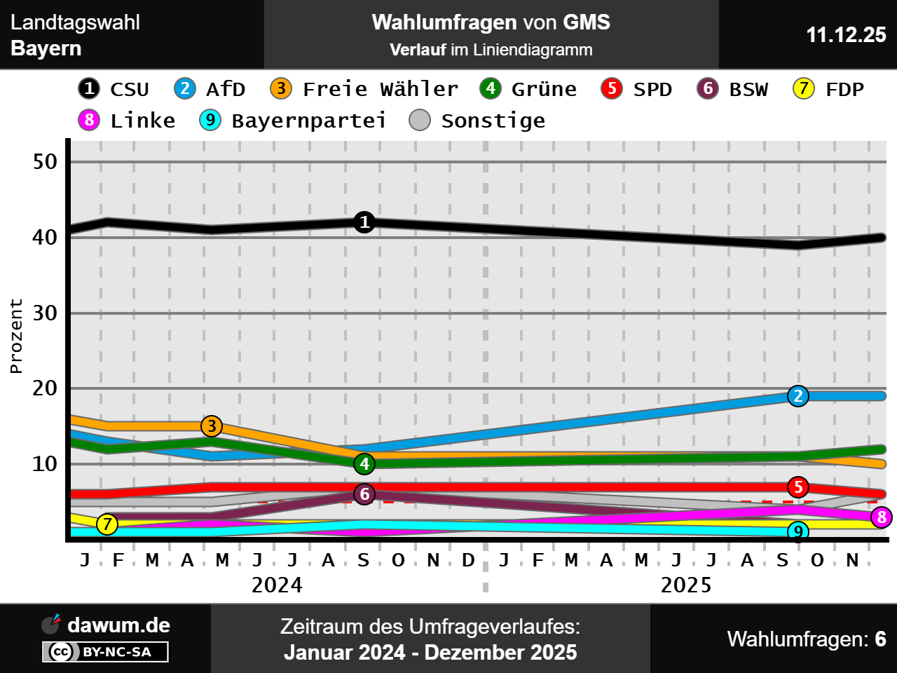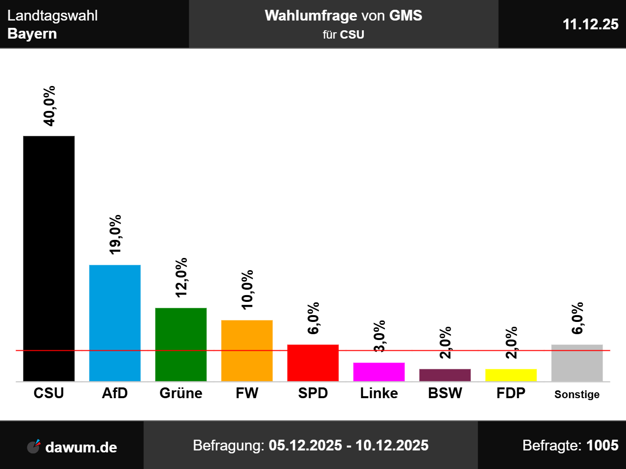 Diese Wahlumfrage (Sonntagsfrage) zur Landtagswahl in Bayern wurde von GMS im Auftrag von CSU durchgeführt und am 11.12.2025 insbesondere bei sueddeutsche.de und wahlrecht.de veröffentlicht. Die Mixed-Befragung (telefonisch und online) fand zwischen dem 05.12.2025 und dem 10.12.2025 bei 1005 Wahlberechtigten statt.