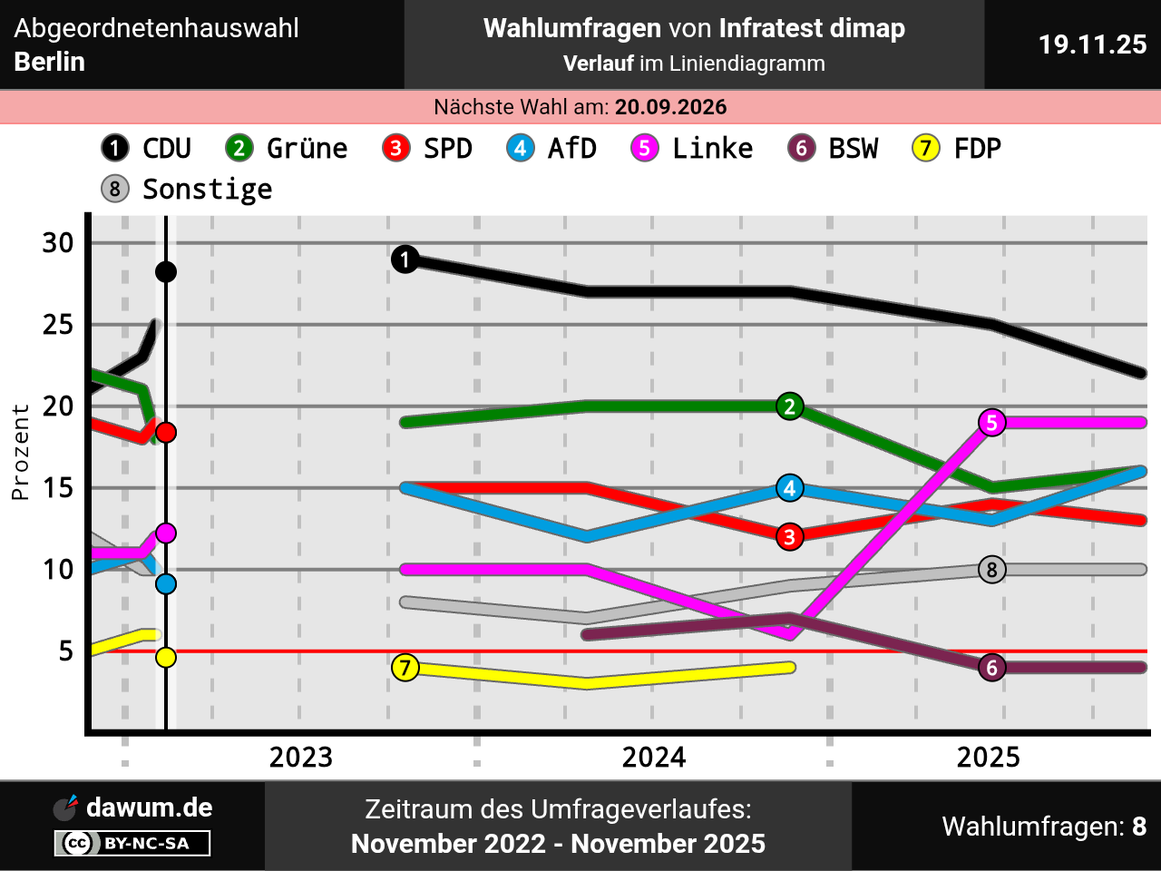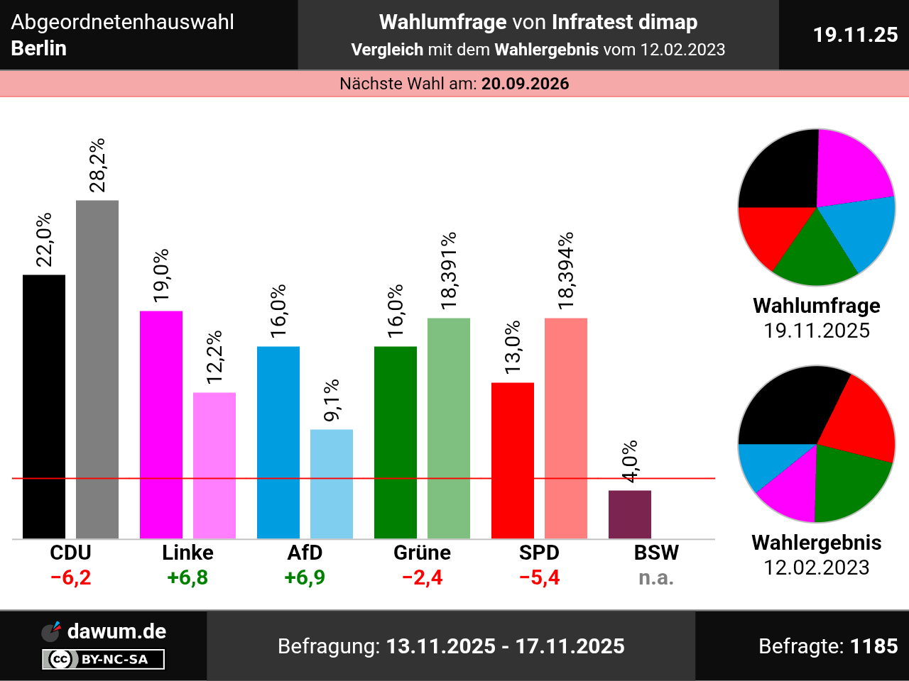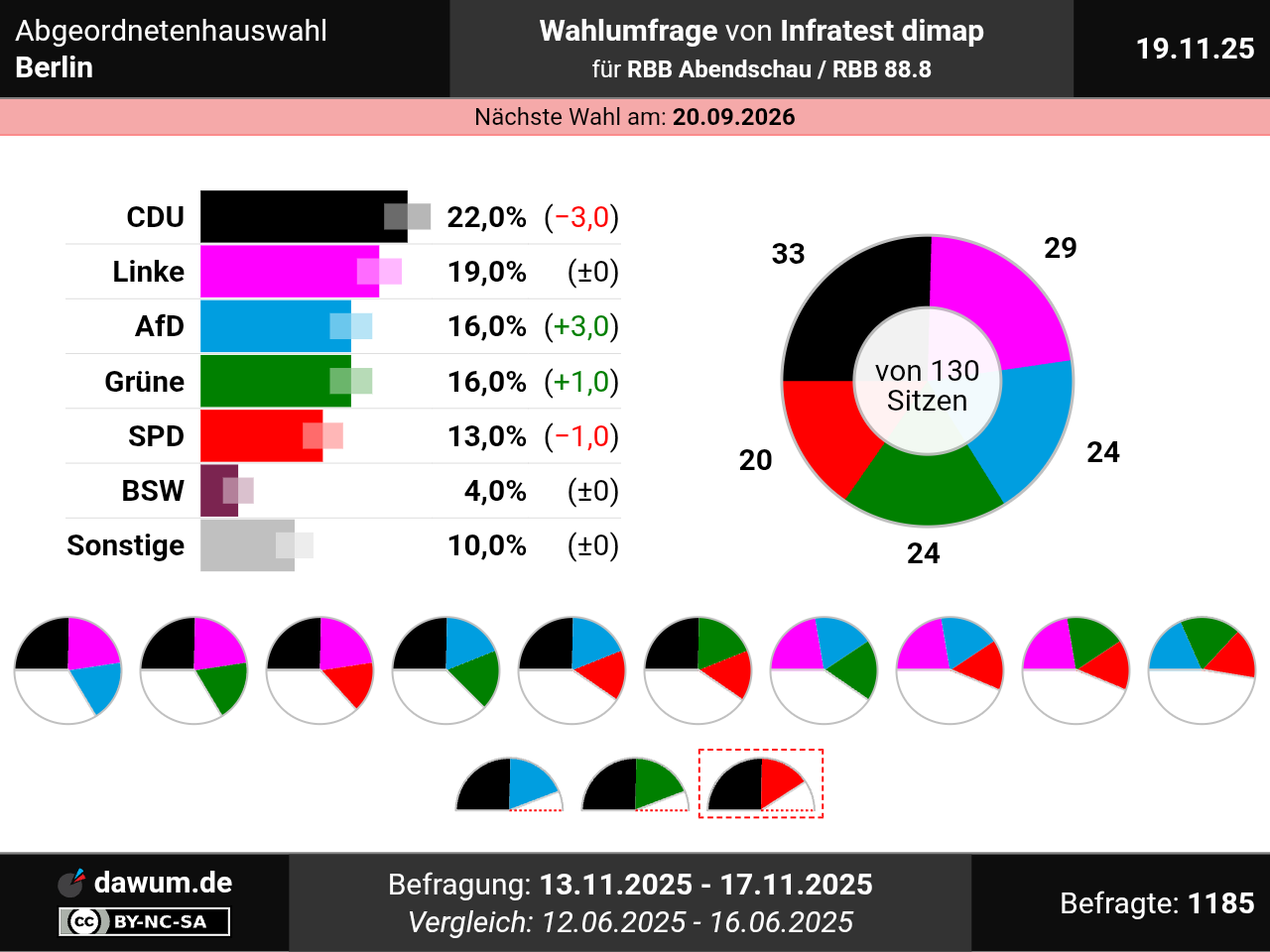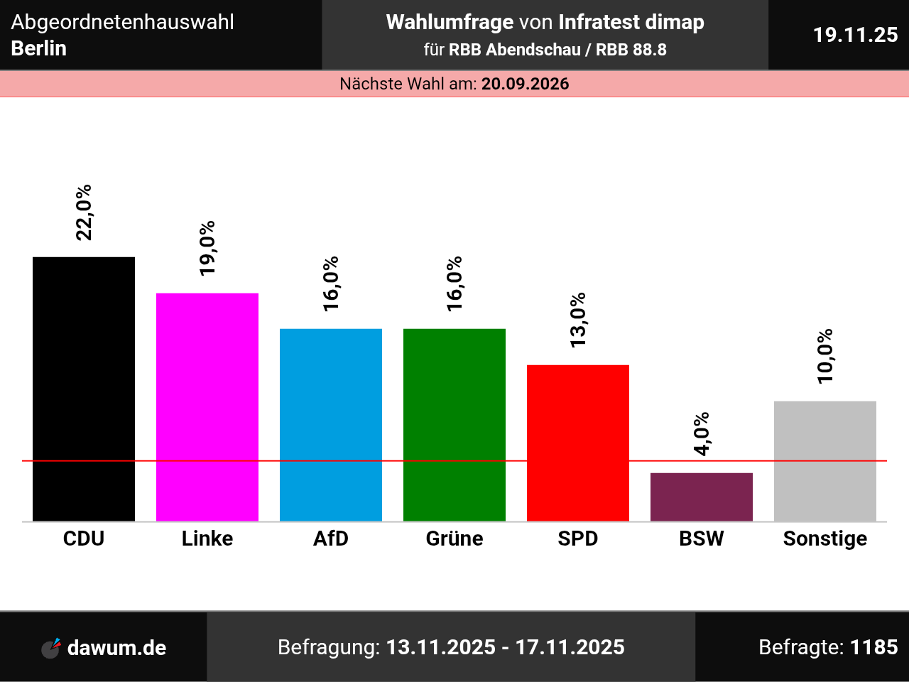 Diese Wahlumfrage (Sonntagsfrage) zur Abgeordnetenhauswahl in Berlin wurde von Infratest dimap im Auftrag von RBB Abendschau / RBB 88.8 durchgeführt und am 19.11.2025 insbesondere bei rbb24.de veröffentlicht. Die Mixed-Befragung (telefonisch und online) fand zwischen dem 13.11.2025 und dem 17.11.2025 bei 1185 Wahlberechtigten statt.