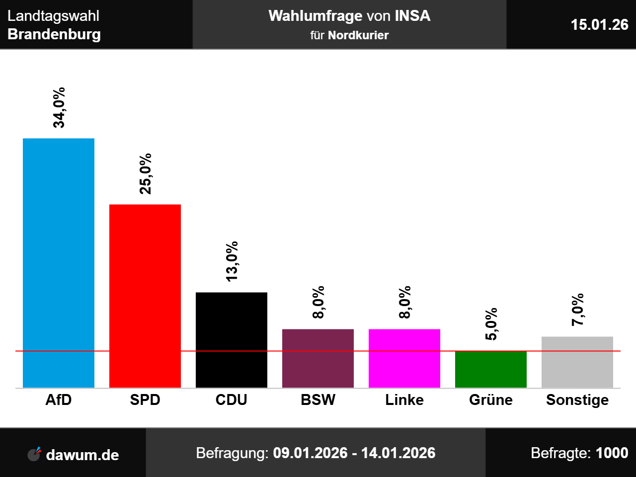Diese Wahlumfrage (Sonntagsfrage) zur Landtagswahl in Brandenburg wurde von INSA im Auftrag von Nordkurier durchgeführt und am 15.01.2026 insbesondere bei tagesspiegel.de veröffentlicht. Die Online-Befragung fand zwischen dem 09.01.2026 und dem 14.01.2026 bei 1000 Wahlberechtigten statt.