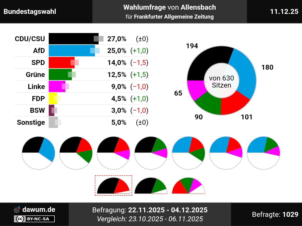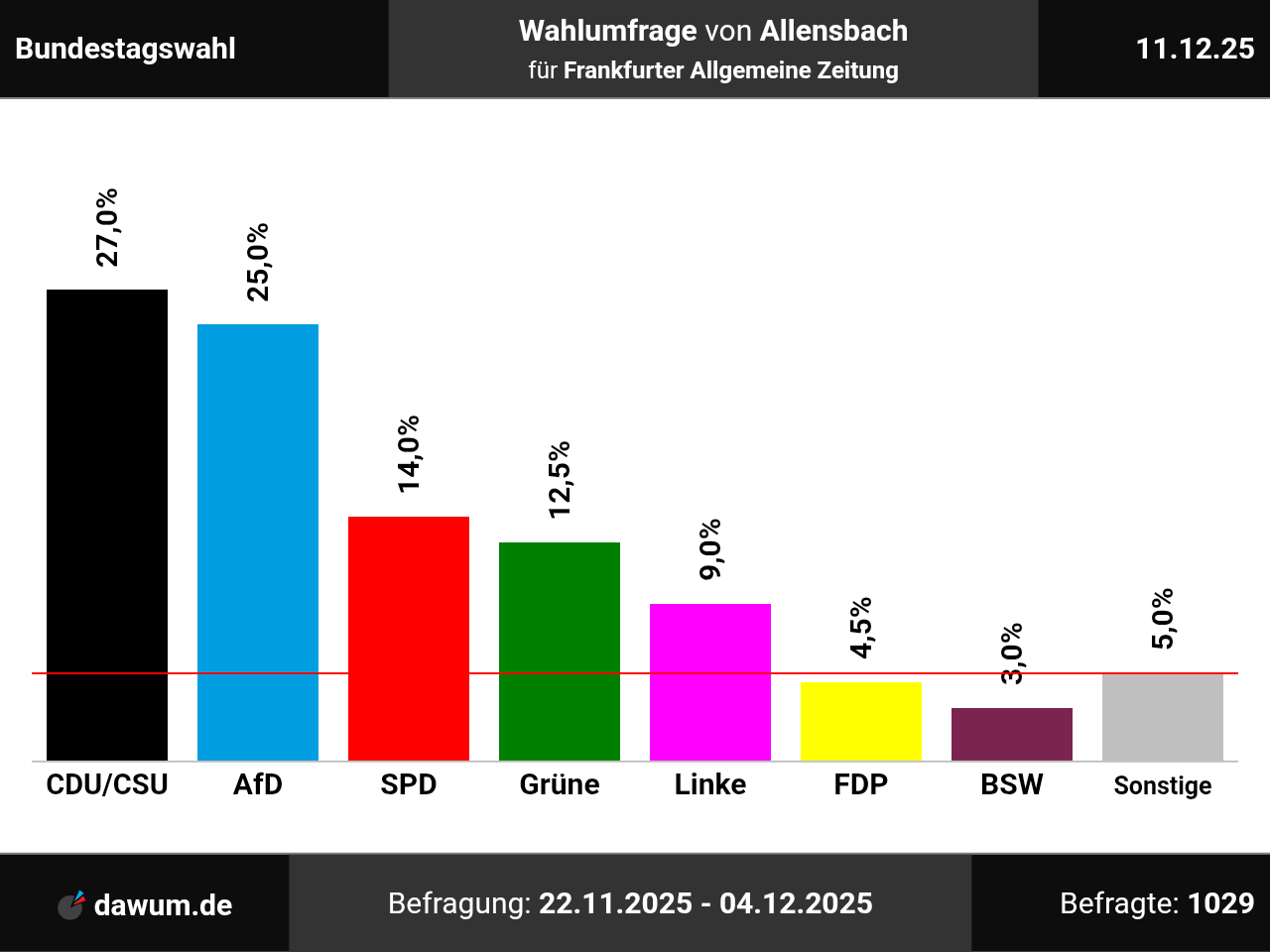 Diese Wahlumfrage (Sonntagsfrage) zur Bundestagswahl wurde von Allensbach im Auftrag von Frankfurter Allgemeine Zeitung durchgeführt und am 11.12.2025 insbesondere bei ifd-allensbach.de veröffentlicht. Die persönliche Befragung fand zwischen dem 22.11.2025 und dem 04.12.2025 bei 1029 Wahlberechtigten statt.