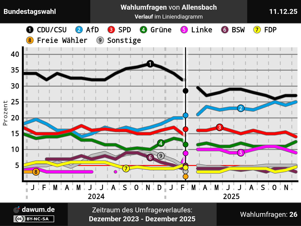Umfrageverlauf bei Allensbach von Dezember 2023 bis Dezember 2025