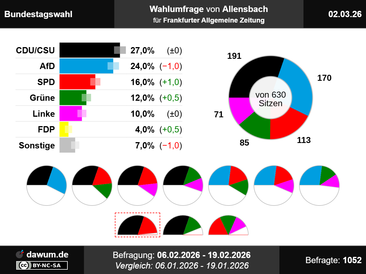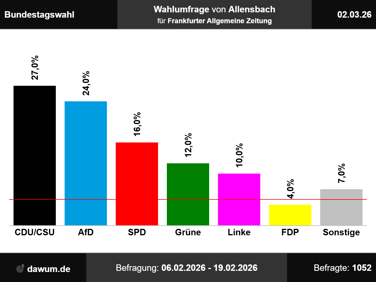 Diese Wahlumfrage (Sonntagsfrage) zur Bundestagswahl wurde von Allensbach im Auftrag von Frankfurter Allgemeine Zeitung durchgeführt und am 02.03.2026 insbesondere bei ifd-allensbach.de veröffentlicht. Die persönliche Befragung fand zwischen dem 06.02.2026 und dem 19.02.2026 bei 1052 Wahlberechtigten statt.