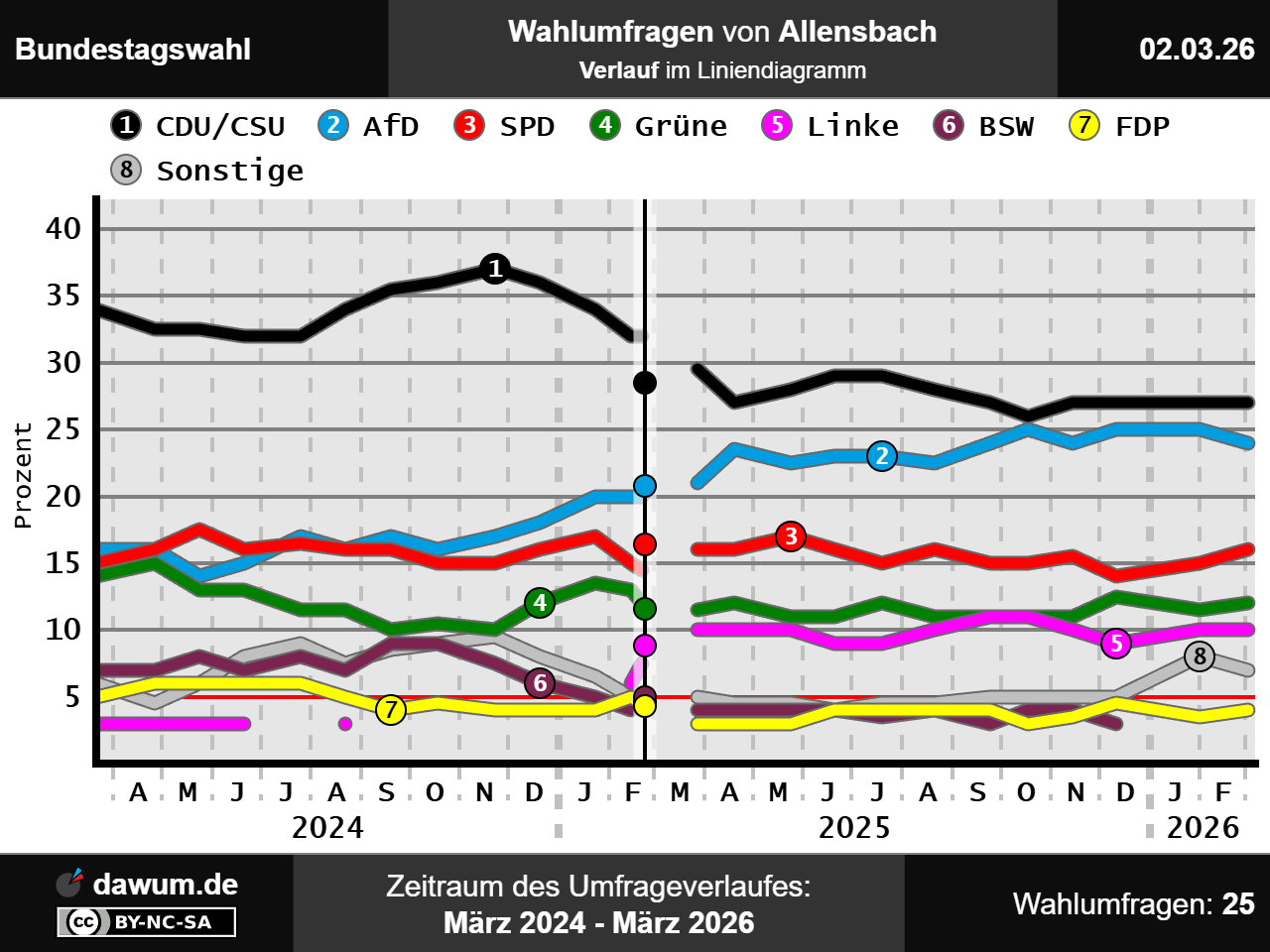 Umfrageverlauf bei Allensbach von März 2024 bis März 2026