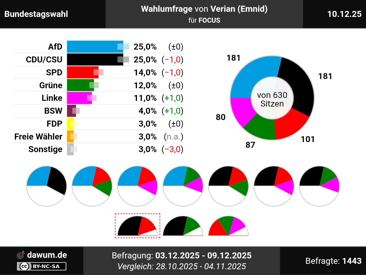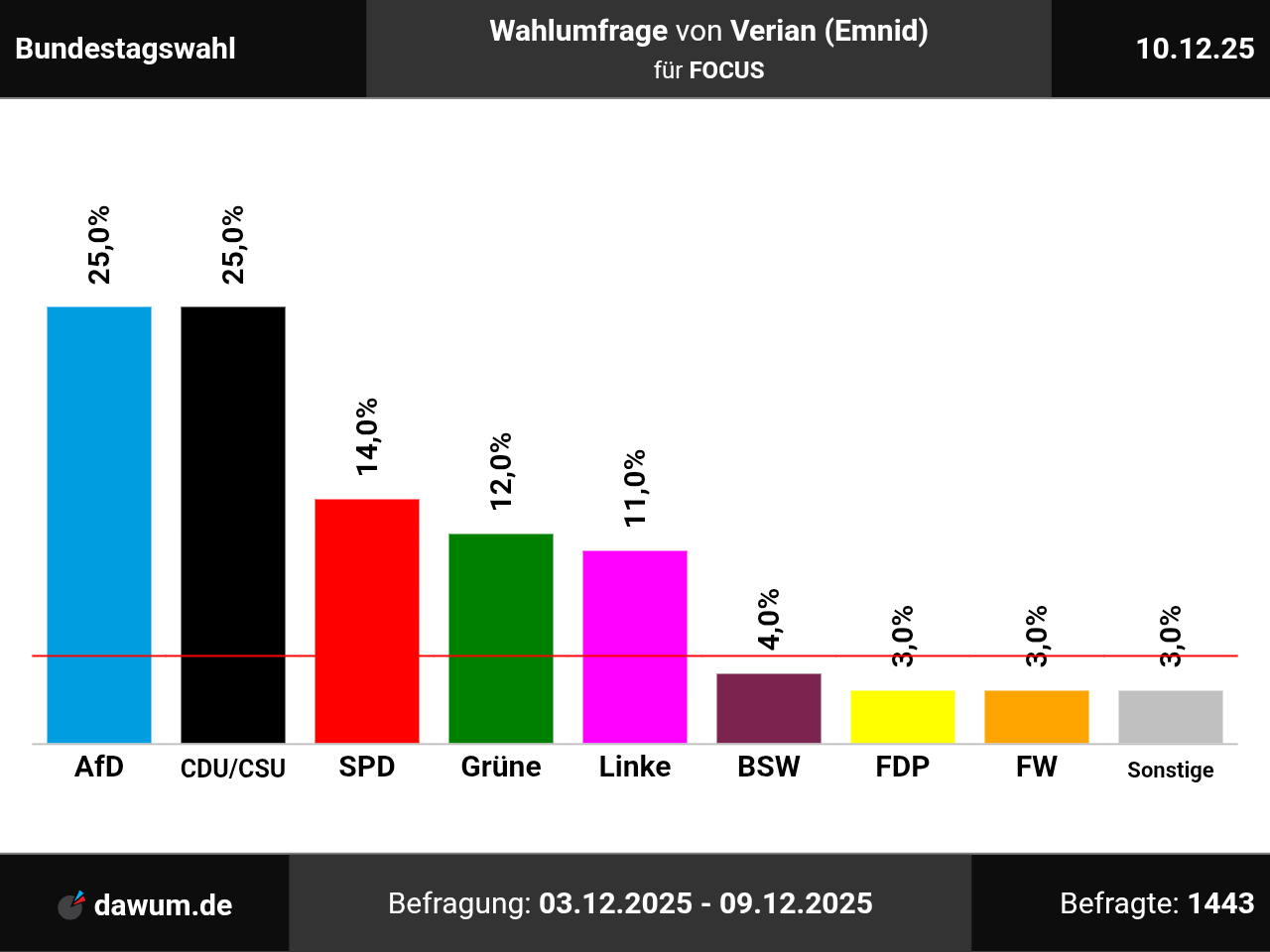 Diese Wahlumfrage (Sonntagsfrage) zur Bundestagswahl wurde von Verian (Emnid) im Auftrag von FOCUS durchgeführt und am 10.12.2025 insbesondere bei wahlrecht.de veröffentlicht. Die telefonische Befragung fand zwischen dem 03.12.2025 und dem 09.12.2025 bei 1443 Wahlberechtigten statt.