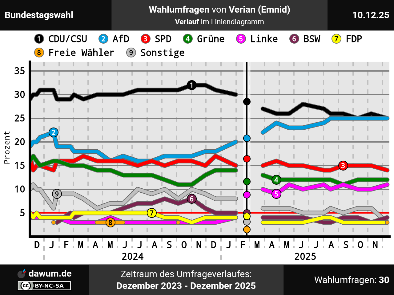 Umfrageverlauf bei Verian (Emnid) von Dezember 2023 bis Dezember 2025