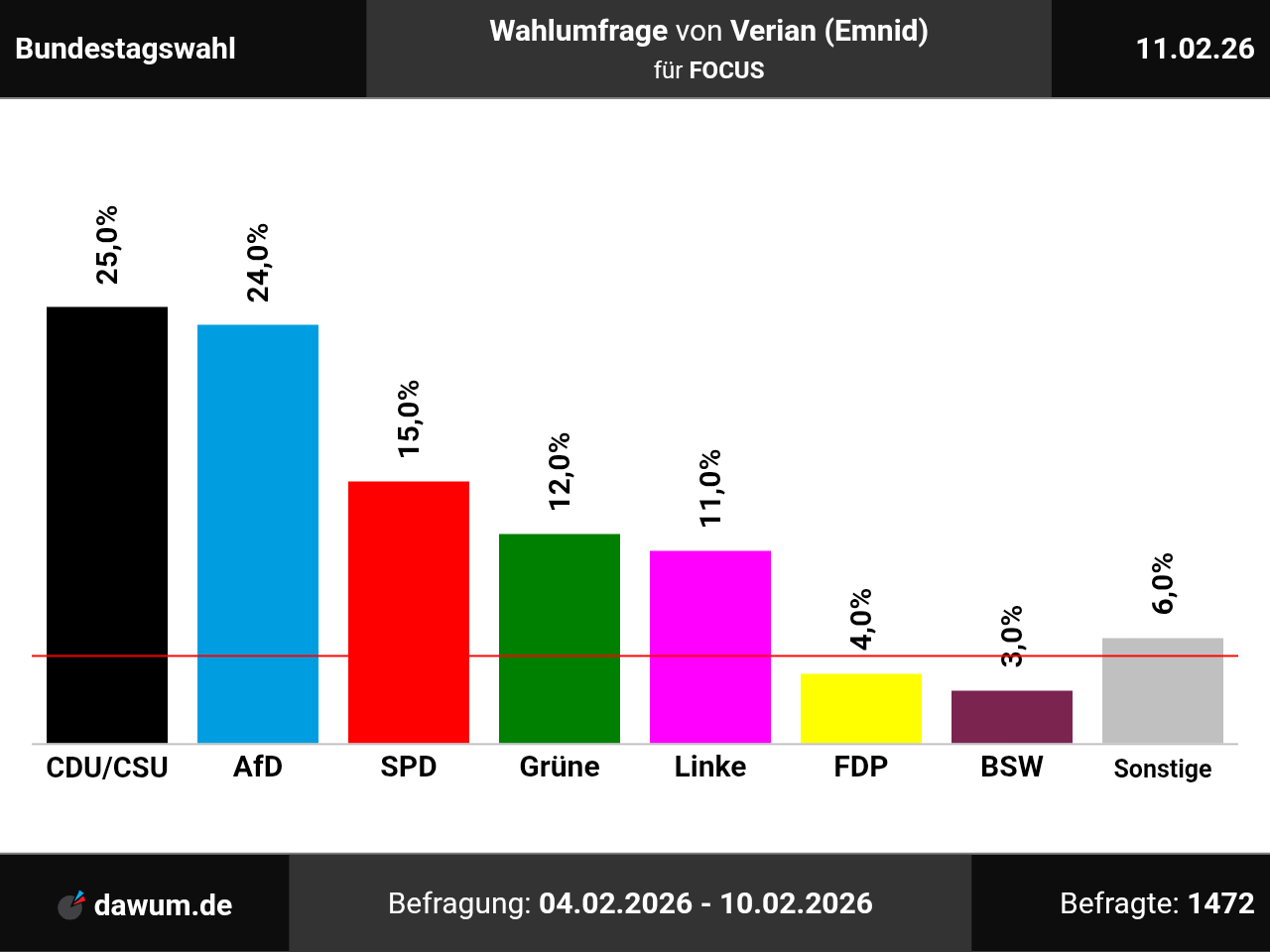 Diese Wahlumfrage (Sonntagsfrage) zur Bundestagswahl wurde von Verian (Emnid) im Auftrag von FOCUS durchgeführt und am 11.02.2026 insbesondere bei wahlrecht.de veröffentlicht. Die telefonische Befragung fand zwischen dem 04.02.2026 und dem 10.02.2026 bei 1472 Wahlberechtigten statt.