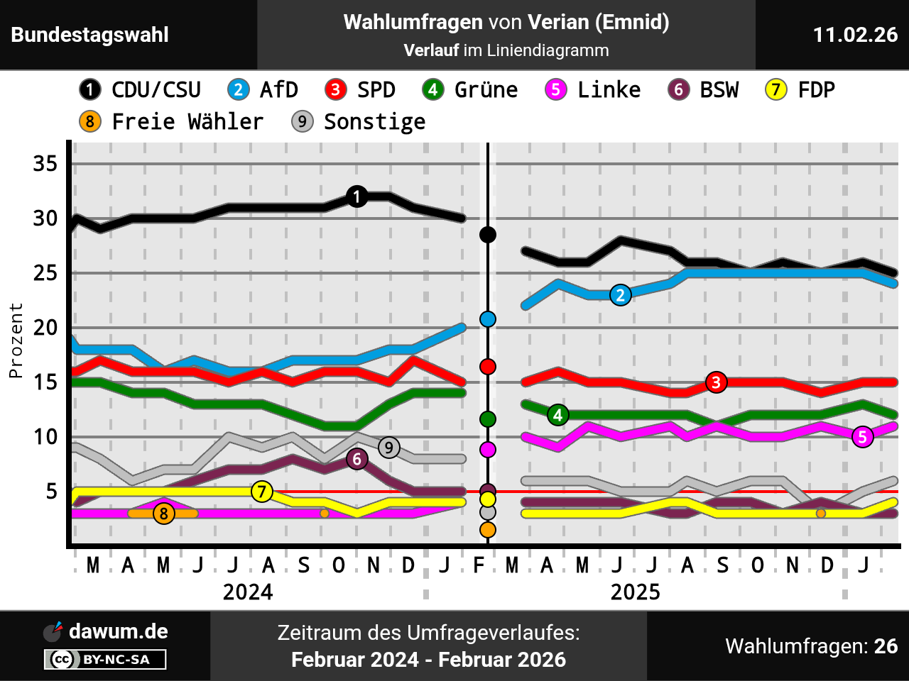 Umfrageverlauf bei Verian (Emnid) von Februar 2024 bis Februar 2026