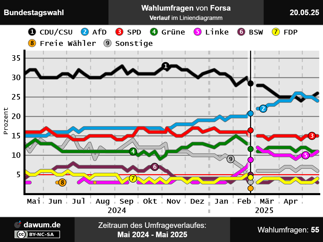 Umfrageverlauf bei Forsa von Mai 2024 bis Mai 2025
