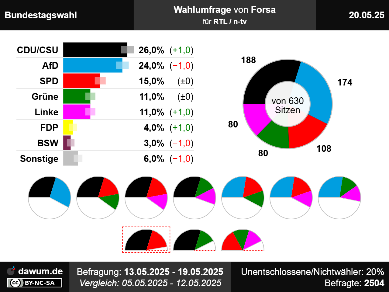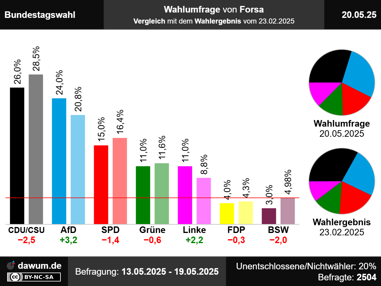 Diese Wahlumfrage (Sonntagsfrage) zur Bundestagswahl wurde von Forsa im Auftrag von RTL / n-tv durchgeführt und am 20.05.2025 insbesondere bei n-tv.de veröffentlicht. Die telefonische Befragung fand zwischen dem 13.05.2025 und dem 19.05.2025 bei 2504 Wahlberechtigten statt.