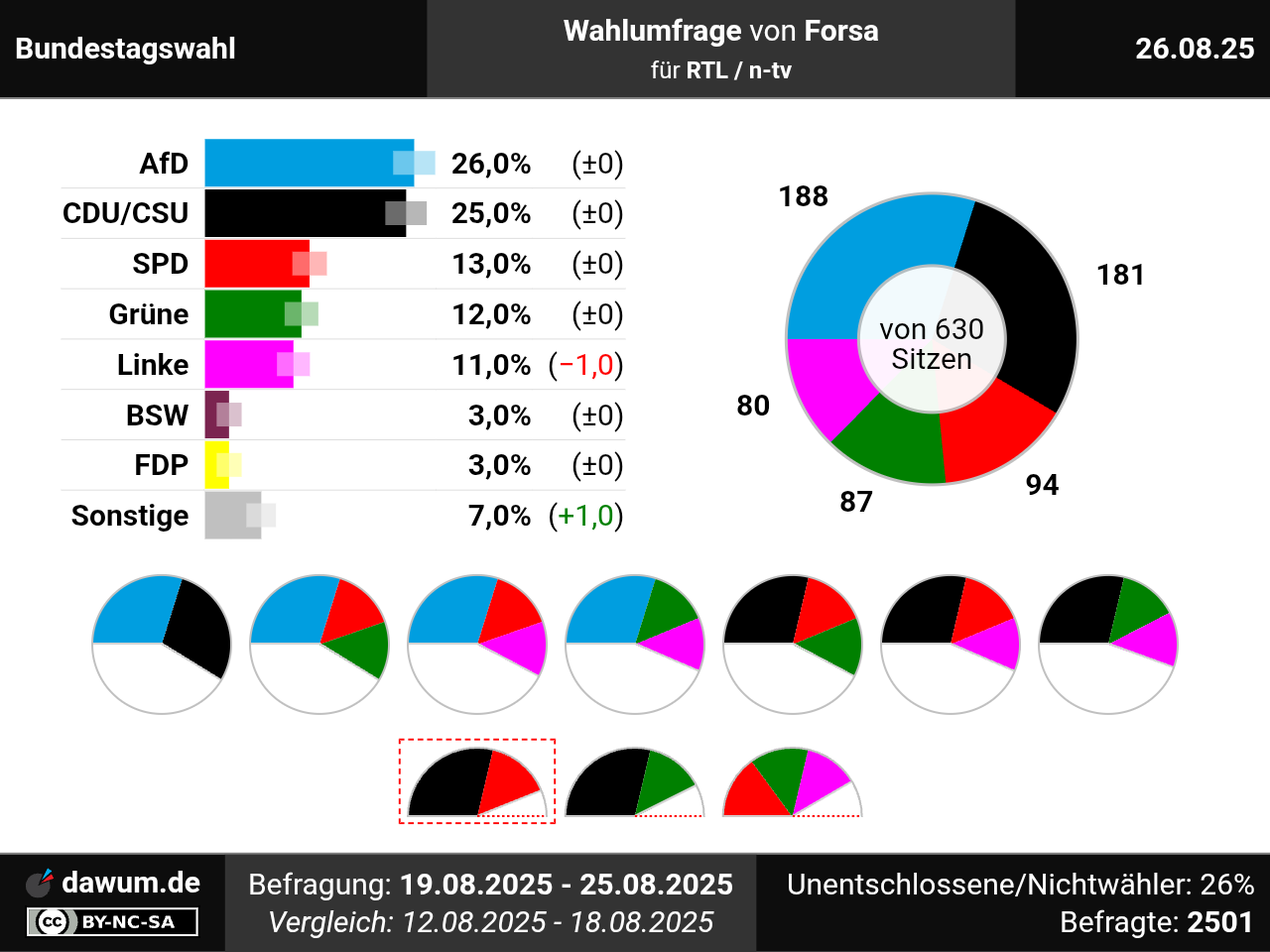 Diese Wahlumfrage (Sonntagsfrage) zur Bundestagswahl wurde von Forsa im Auftrag von RTL / n-tv durchgeführt und am 26.08.2025 insbesondere bei n-tv.de veröffentlicht. Die telefonische Befragung fand zwischen dem 19.08.2025 und dem 25.08.2025 bei 2501 Wahlberechtigten statt.
