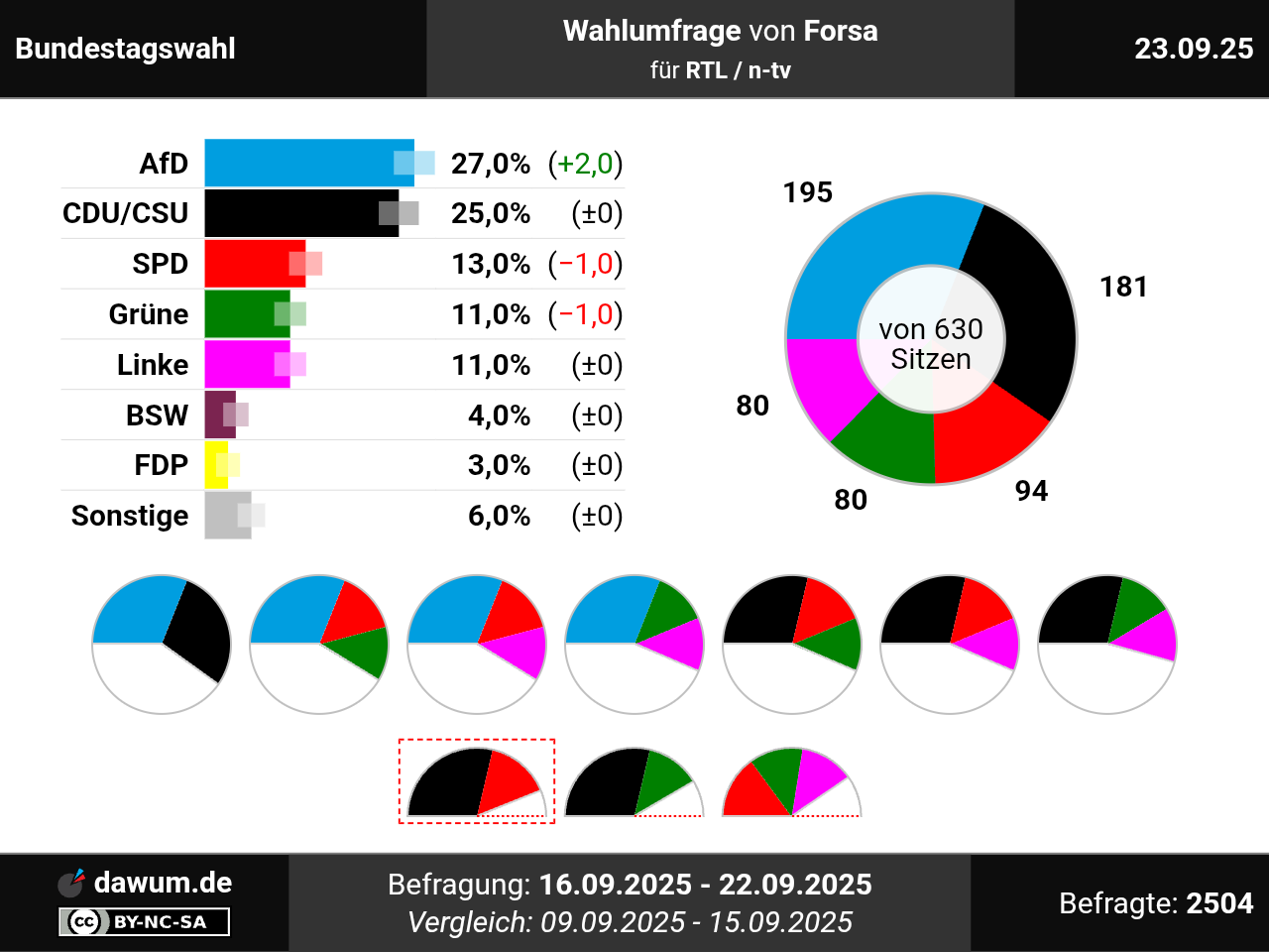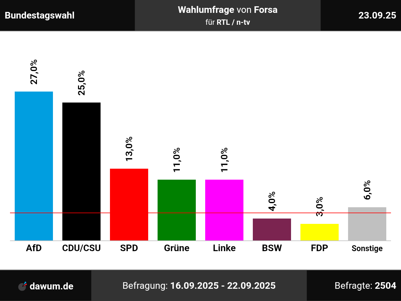 Diese Wahlumfrage (Sonntagsfrage) zur Bundestagswahl wurde von Forsa im Auftrag von RTL / n-tv durchgeführt und am 23.09.2025 insbesondere bei n-tv.de veröffentlicht. Die telefonische Befragung fand zwischen dem 16.09.2025 und dem 22.09.2025 bei 2504 Wahlberechtigten statt.