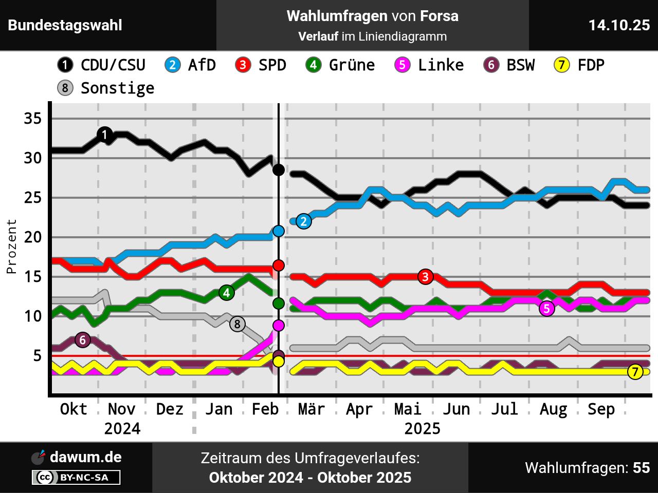 Umfrageverlauf bei Forsa von Oktober 2024 bis Oktober 2025