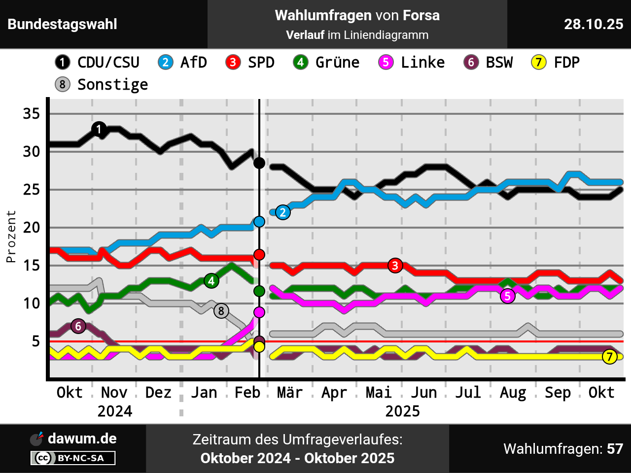 Umfrageverlauf bei Forsa von Oktober 2024 bis Oktober 2025