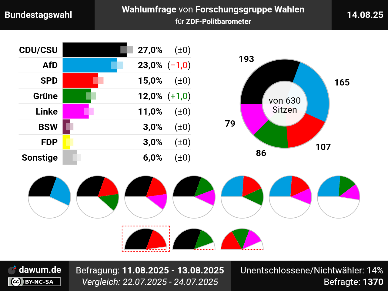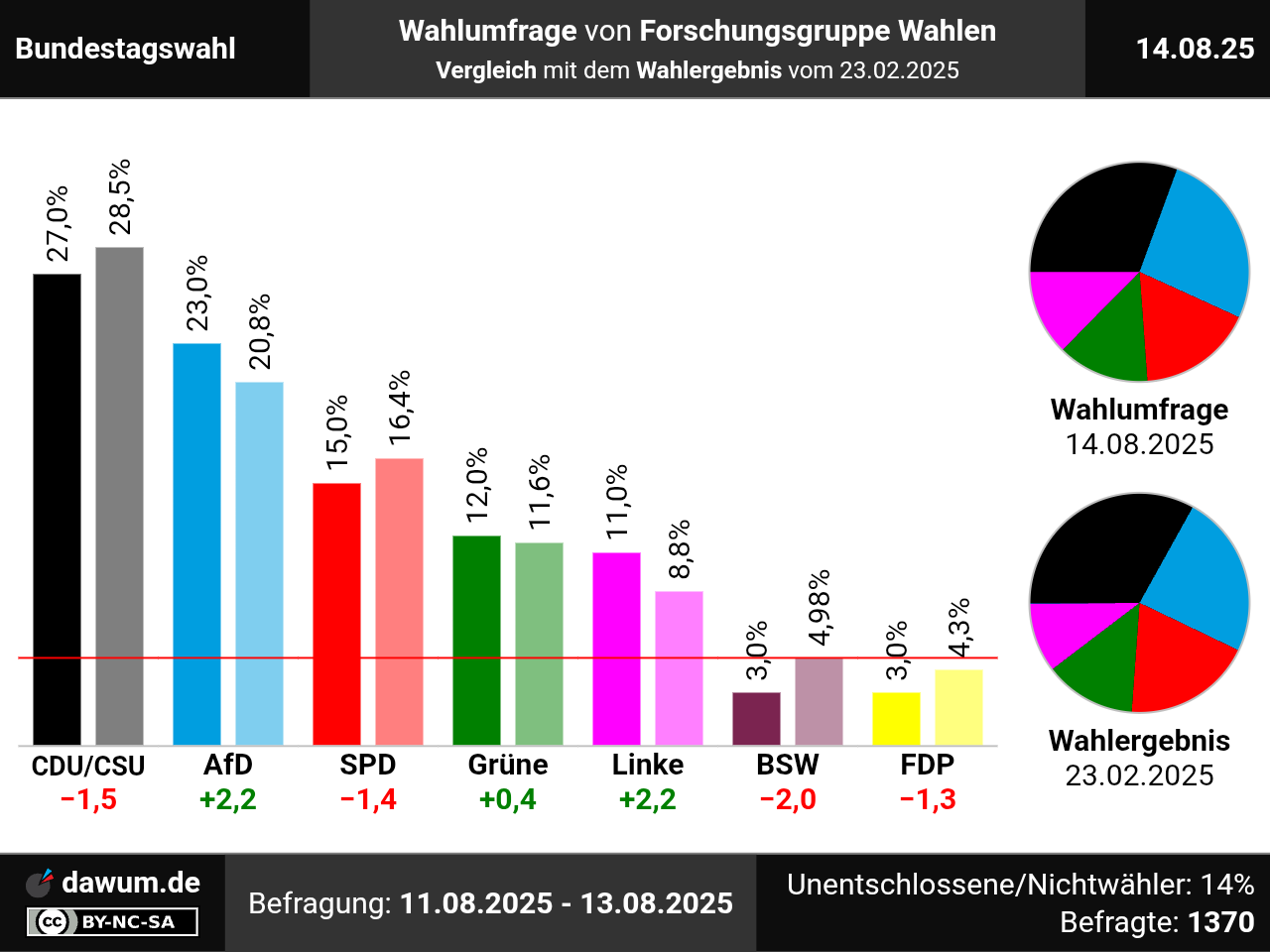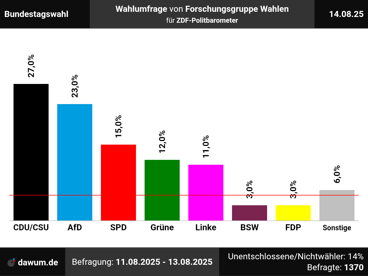 Diese Wahlumfrage (Sonntagsfrage) zur Bundestagswahl wurde von Forschungsgruppe Wahlen im Auftrag von ZDF-Politbarometer durchgeführt und am 14.08.2025 insbesondere bei zdfheute.de veröffentlicht. Die Mixed-Befragung (telefonisch und online) fand zwischen dem 11.08.2025 und dem 13.08.2025 bei 1370 Wahlberechtigten statt.