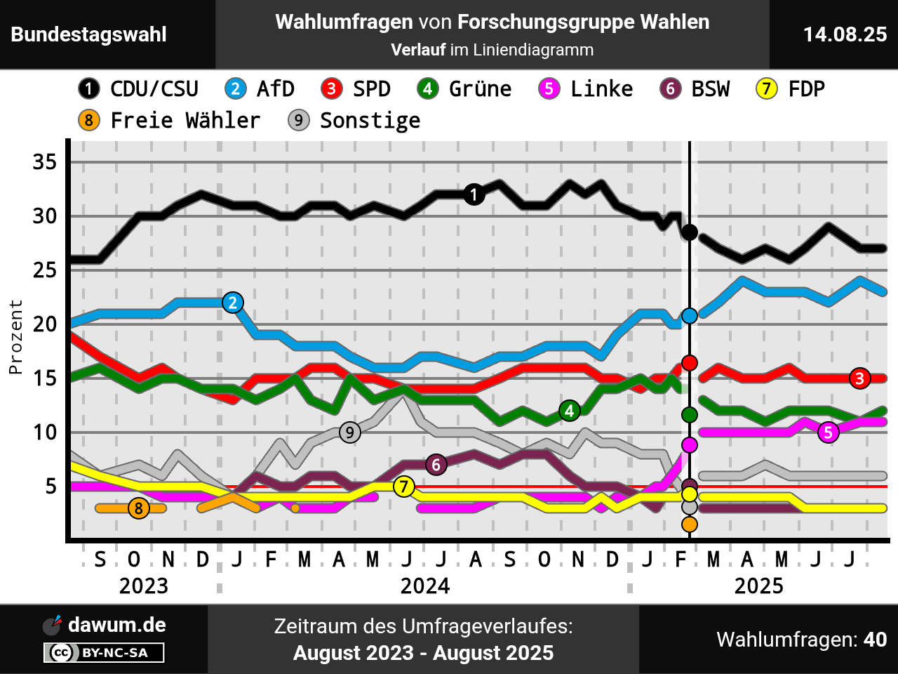 Umfrageverlauf bei Forschungsgruppe Wahlen von August 2023 bis August 2025