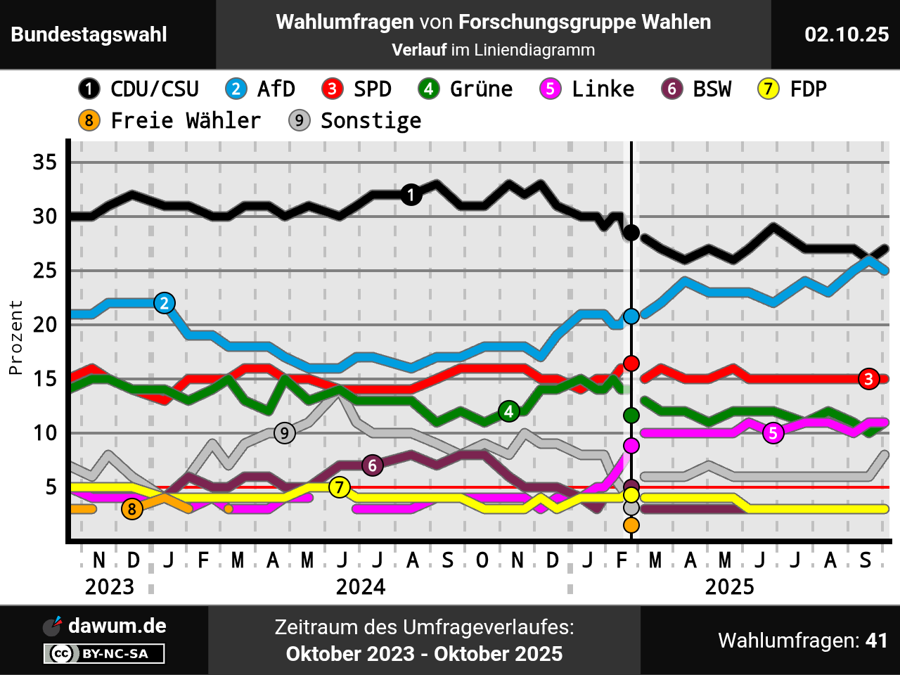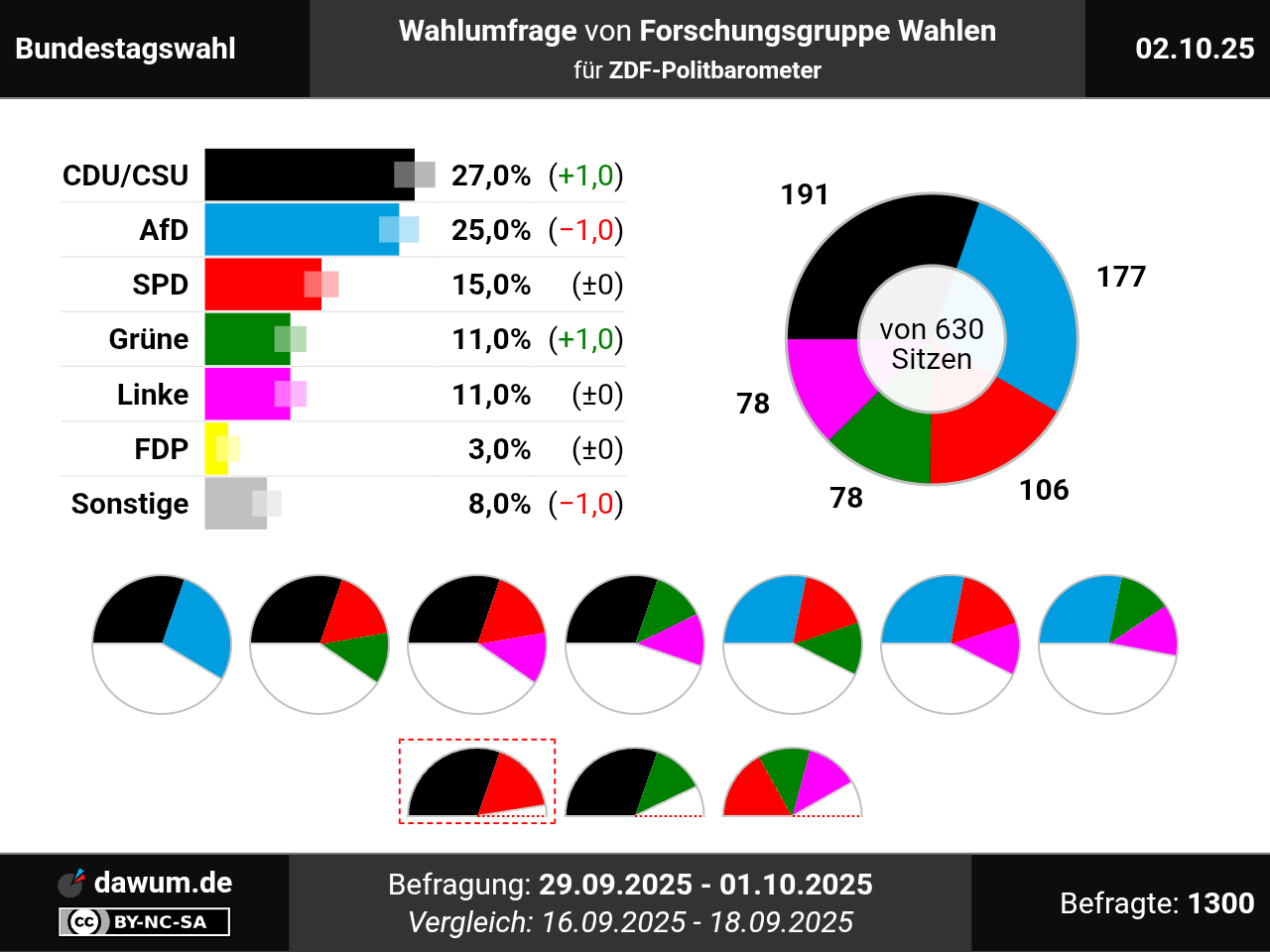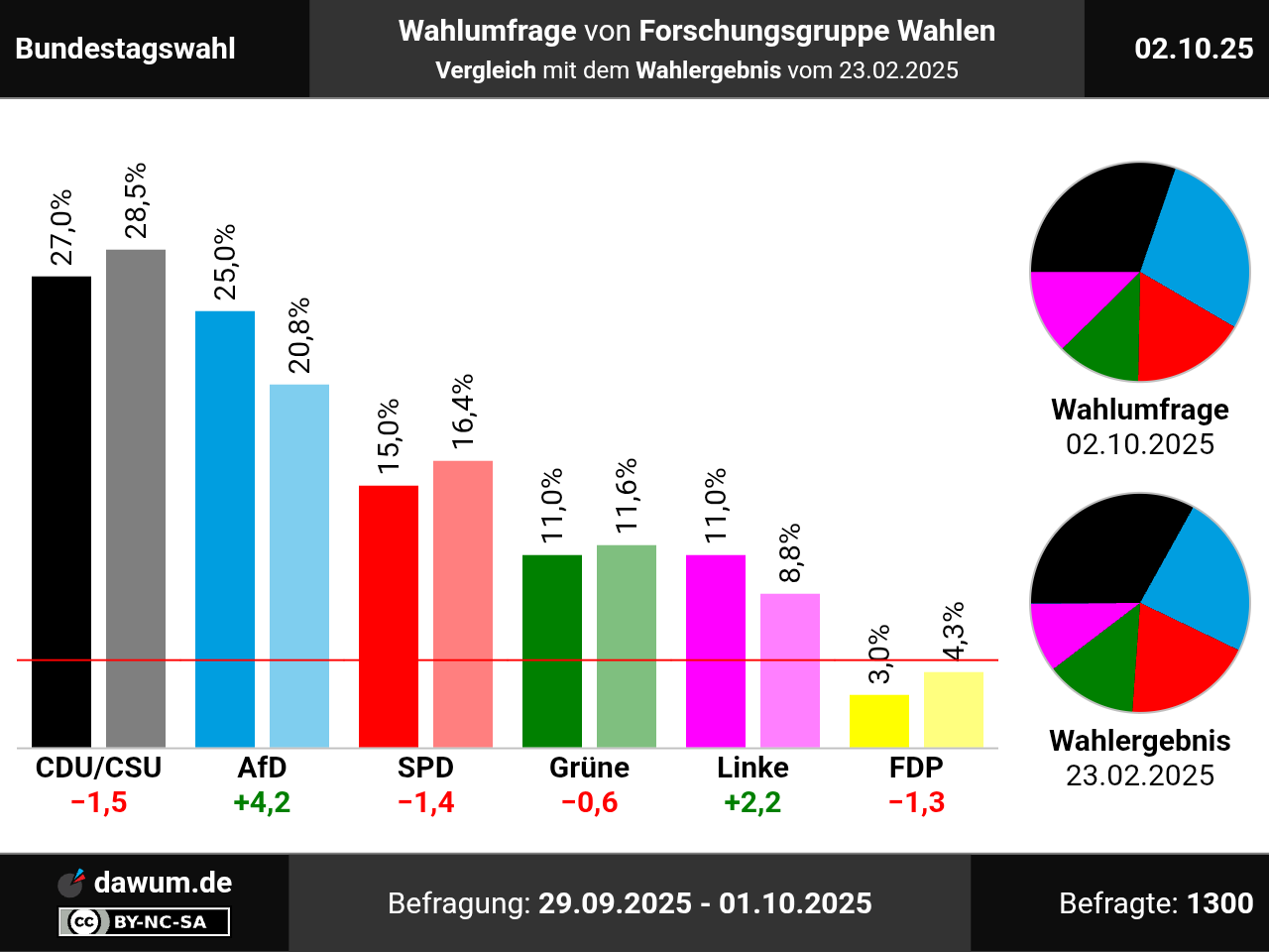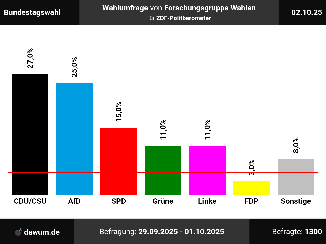 Diese Wahlumfrage (Sonntagsfrage) zur Bundestagswahl wurde von Forschungsgruppe Wahlen im Auftrag von ZDF-Politbarometer durchgeführt und am 02.10.2025 insbesondere bei zdfheute.de veröffentlicht. Die Mixed-Befragung (telefonisch und online) fand zwischen dem 29.09.2025 und dem 01.10.2025 bei 1300 Wahlberechtigten statt.