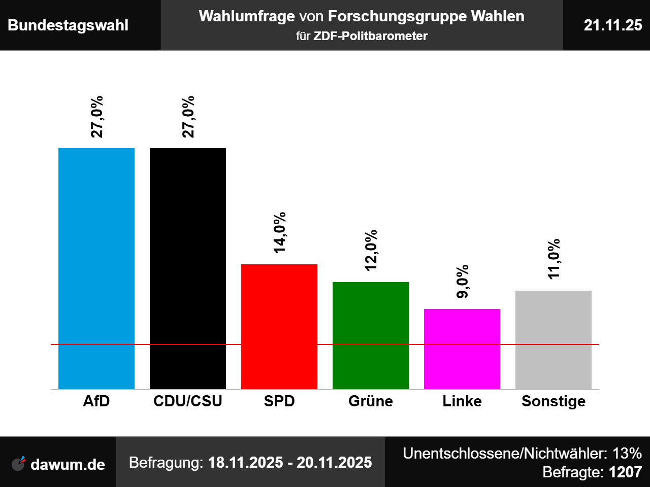 Diese Wahlumfrage (Sonntagsfrage) zur Bundestagswahl wurde von Forschungsgruppe Wahlen im Auftrag von ZDF-Politbarometer durchgeführt und am 21.11.2025 insbesondere bei zdfheute.de veröffentlicht. Die Mixed-Befragung (telefonisch und online) fand zwischen dem 18.11.2025 und dem 20.11.2025 bei 1207 Wahlberechtigten statt.