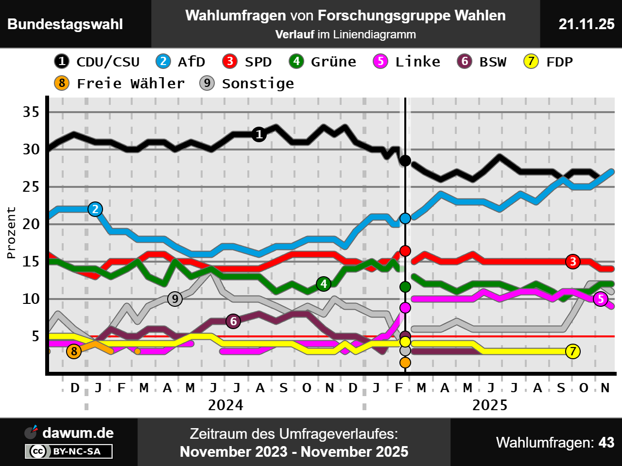 Umfrageverlauf bei Forschungsgruppe Wahlen von November 2023 bis November 2025