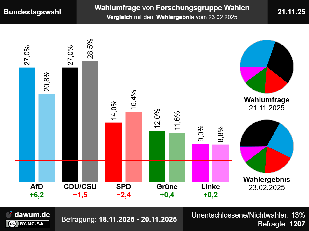 Nach dieser Wahlumfrage würden die AfD und die Union (CDU/CSU) jeweils 27%, die SPD 14%, Bündnis 90/Die Grünen 12%, die sonstigen Parteien 11% sowie Die Linke 9% erhalten. Im Vergleich zur vorherigen Wahlumfrage vom 07.11.2025 gewinnen die AfD und die Union (CDU/CSU) jeweils 1 Prozentpunkt(e) hinzu, während Die Linke und die sonstigen Parteien jeweils 1 Prozentpunkt(e) verlieren. Sofern eine Partei zuvor nicht aufgeführt wurde, wird beim Vergleich n.a. angezeigt.