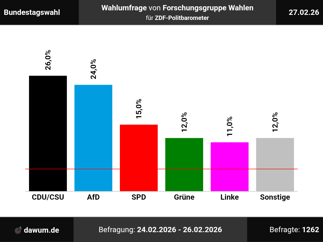 Diese Wahlumfrage (Sonntagsfrage) zur Bundestagswahl wurde von Forschungsgruppe Wahlen im Auftrag von ZDF-Politbarometer durchgeführt und am 27.02.2026 insbesondere bei zdfheute.de veröffentlicht. Die Mixed-Befragung (telefonisch und online) fand zwischen dem 24.02.2026 und dem 26.02.2026 bei 1262 Wahlberechtigten statt.