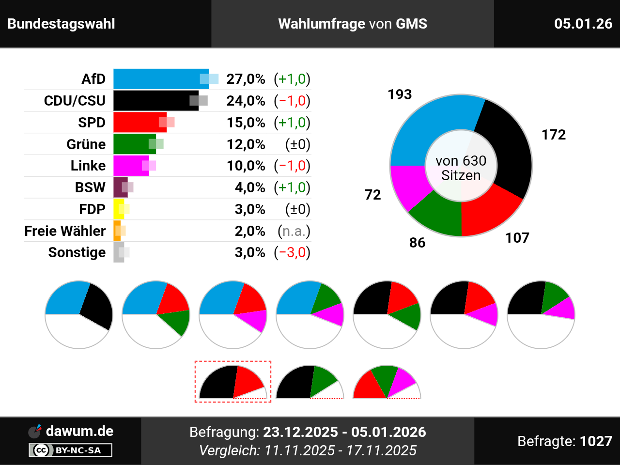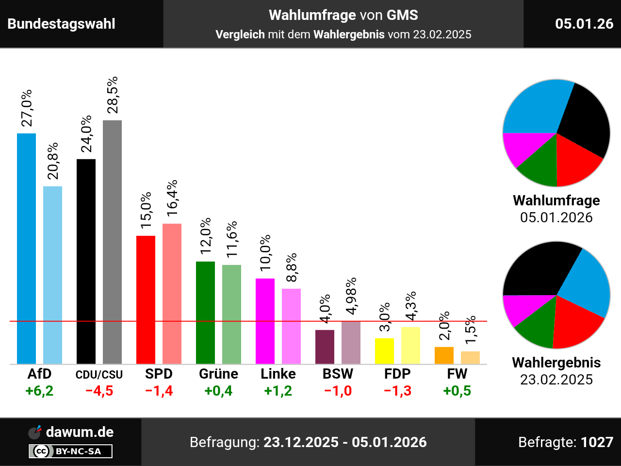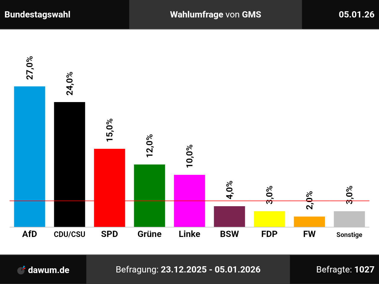 Die neueste Wahlumfrage (Sonntagsfrage) von GMS zur Bundestagswahl wurde in eigenem Auftrag durchgeführt und am 05.01.2026 insbesondere bei msn.com veröffentlicht. Die Mixed-Befragung (telefonisch und online) fand zwischen dem 23.12.2025 und dem 05.01.2026 bei 1027 Wahlberechtigten statt.