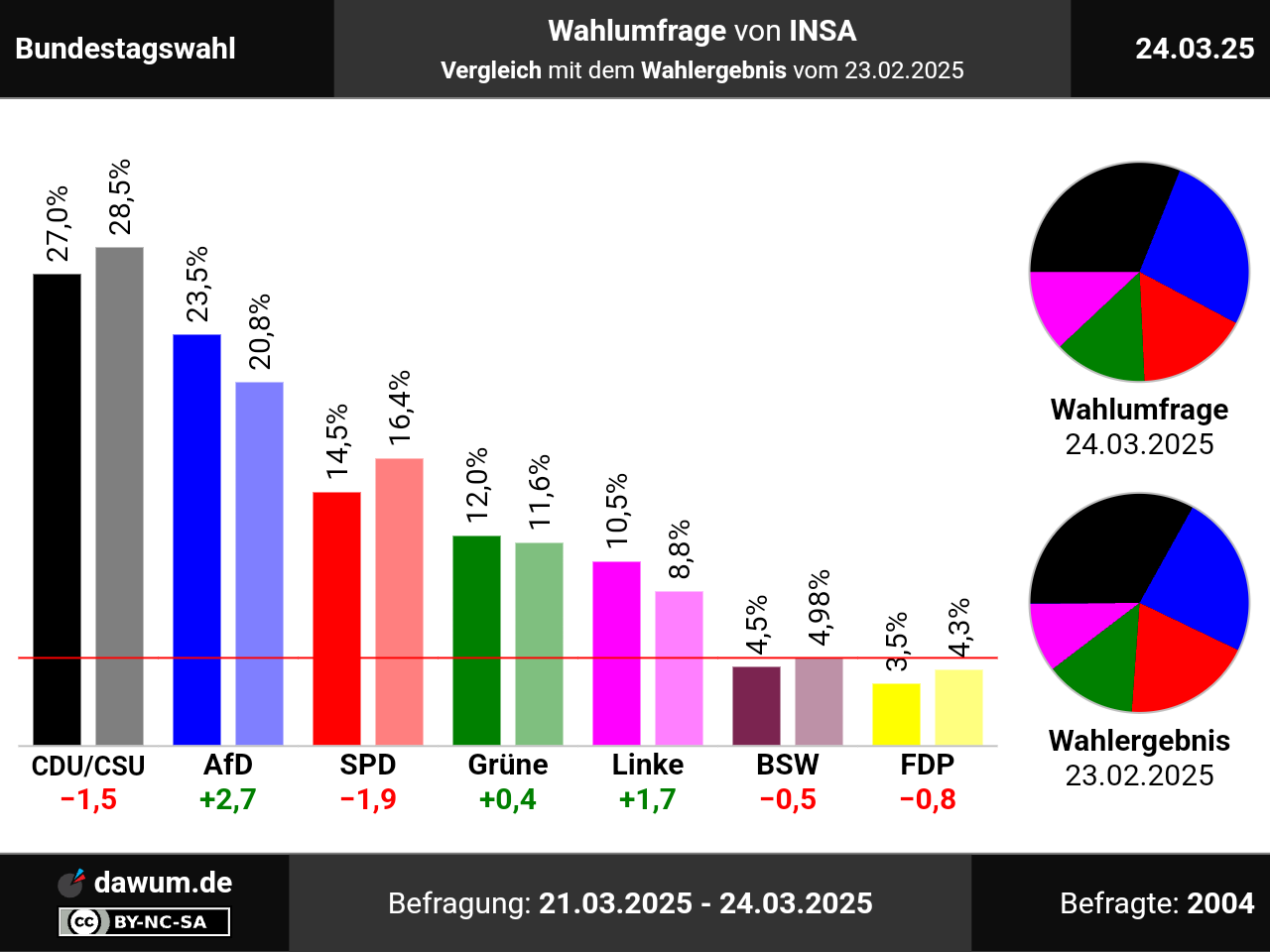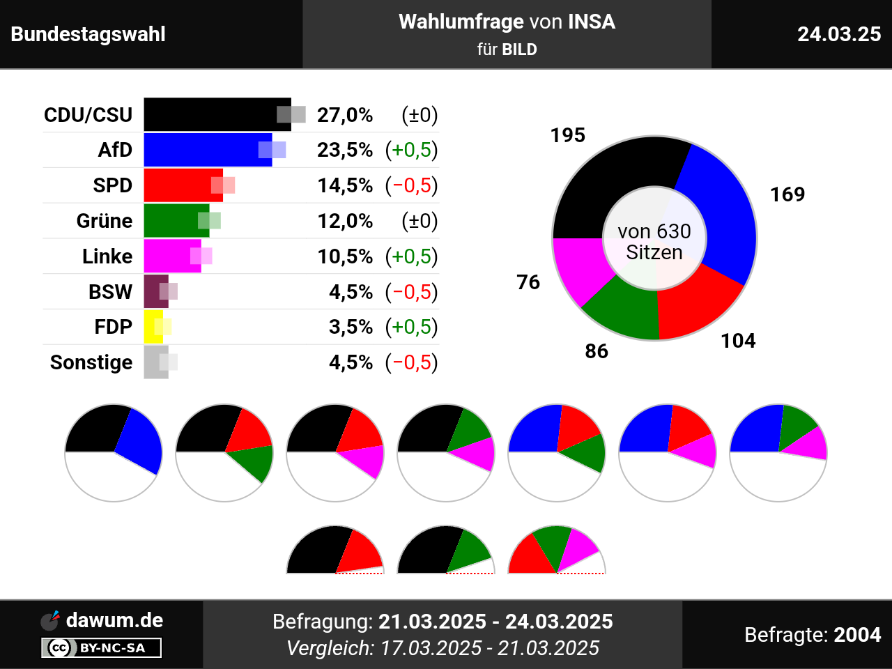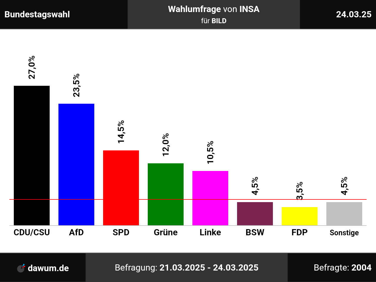 Diese Wahlumfrage (Sonntagsfrage) zur Bundestagswahl wurde von INSA im Auftrag von BILD durchgeführt und am 24.03.2025 insbesondere bei msn.com veröffentlicht. Die Online-Befragung fand zwischen dem 21.03.2025 und dem 24.03.2025 bei 2004 Wahlberechtigten statt.