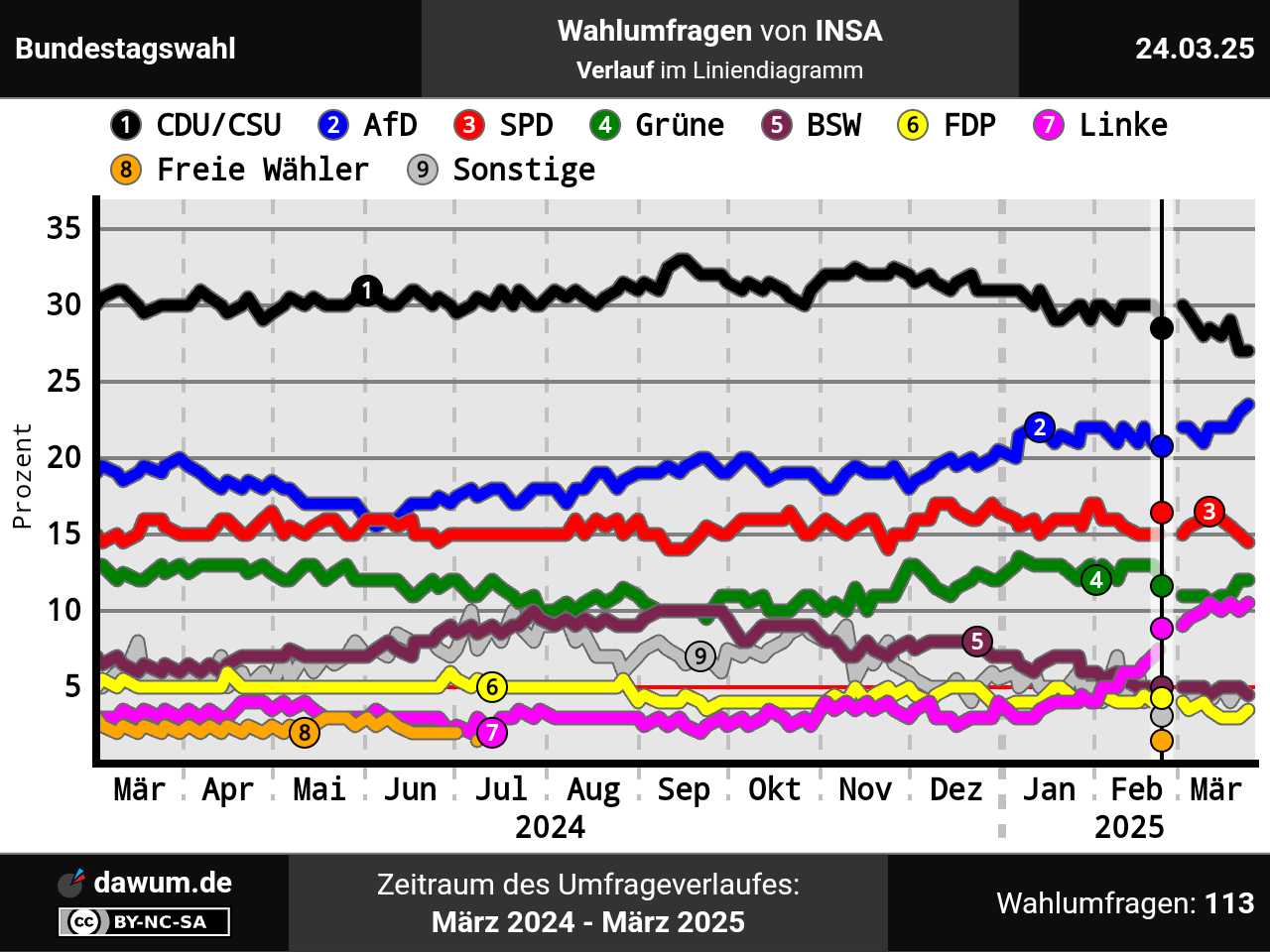 Umfrageverlauf bei INSA von März 2024 bis März 2025