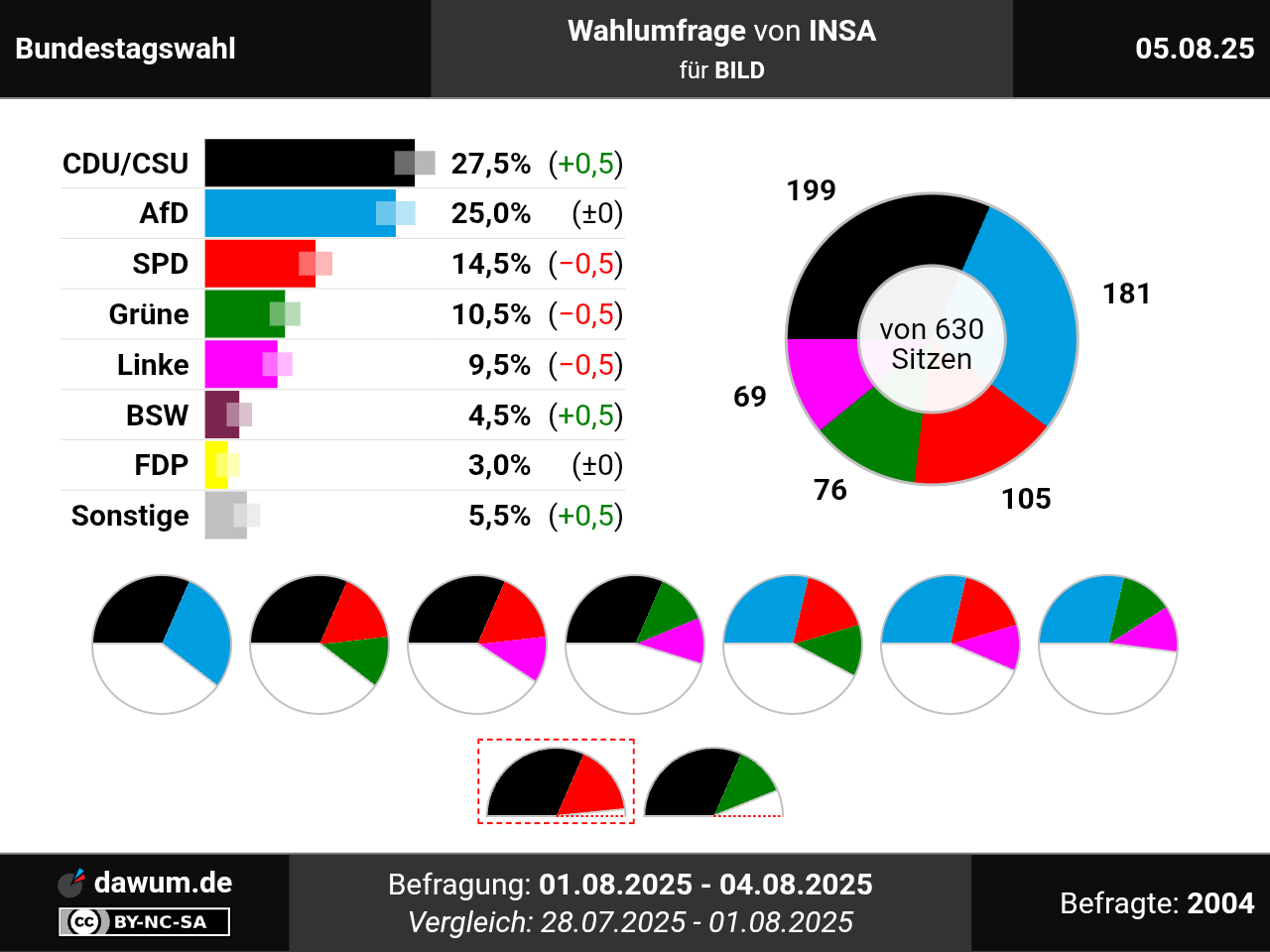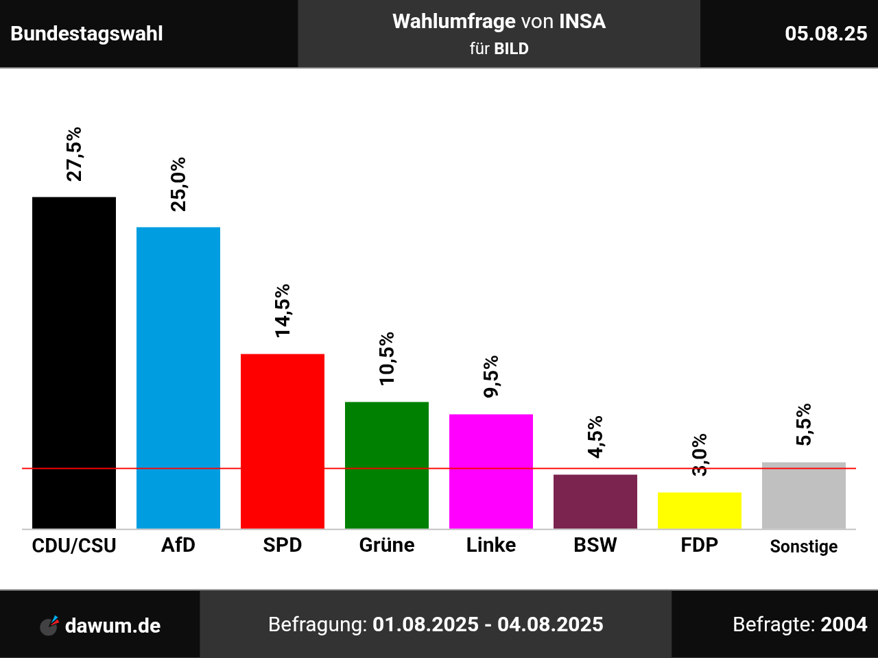 Diese Wahlumfrage (Sonntagsfrage) zur Bundestagswahl wurde von INSA im Auftrag von BILD durchgeführt und am 05.08.2025 insbesondere bei bild.de veröffentlicht. Die Online-Befragung fand zwischen dem 01.08.2025 und dem 04.08.2025 bei 2004 Wahlberechtigten statt.