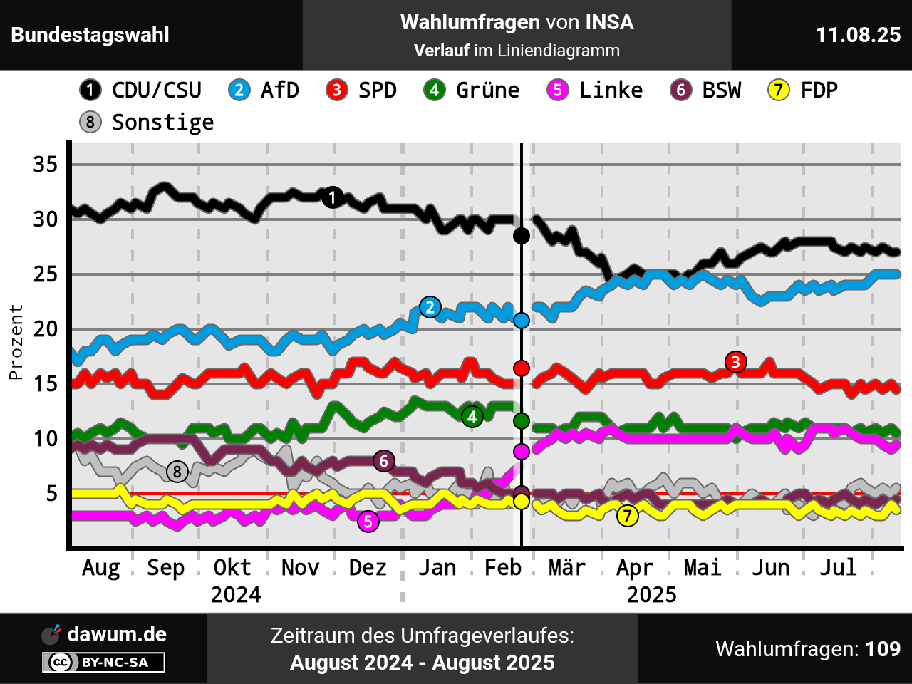 Umfrageverlauf bei INSA von August 2024 bis August 2025