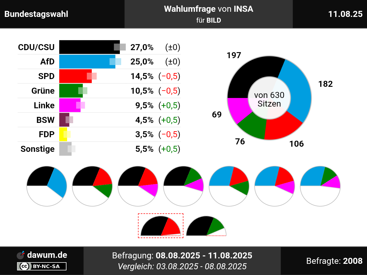 Diese Wahlumfrage (Sonntagsfrage) zur Bundestagswahl wurde von INSA im Auftrag von BILD durchgeführt und am 11.08.2025 insbesondere bei bild.de veröffentlicht. Die Online-Befragung fand zwischen dem 08.08.2025 und dem 11.08.2025 bei 2008 Wahlberechtigten statt.