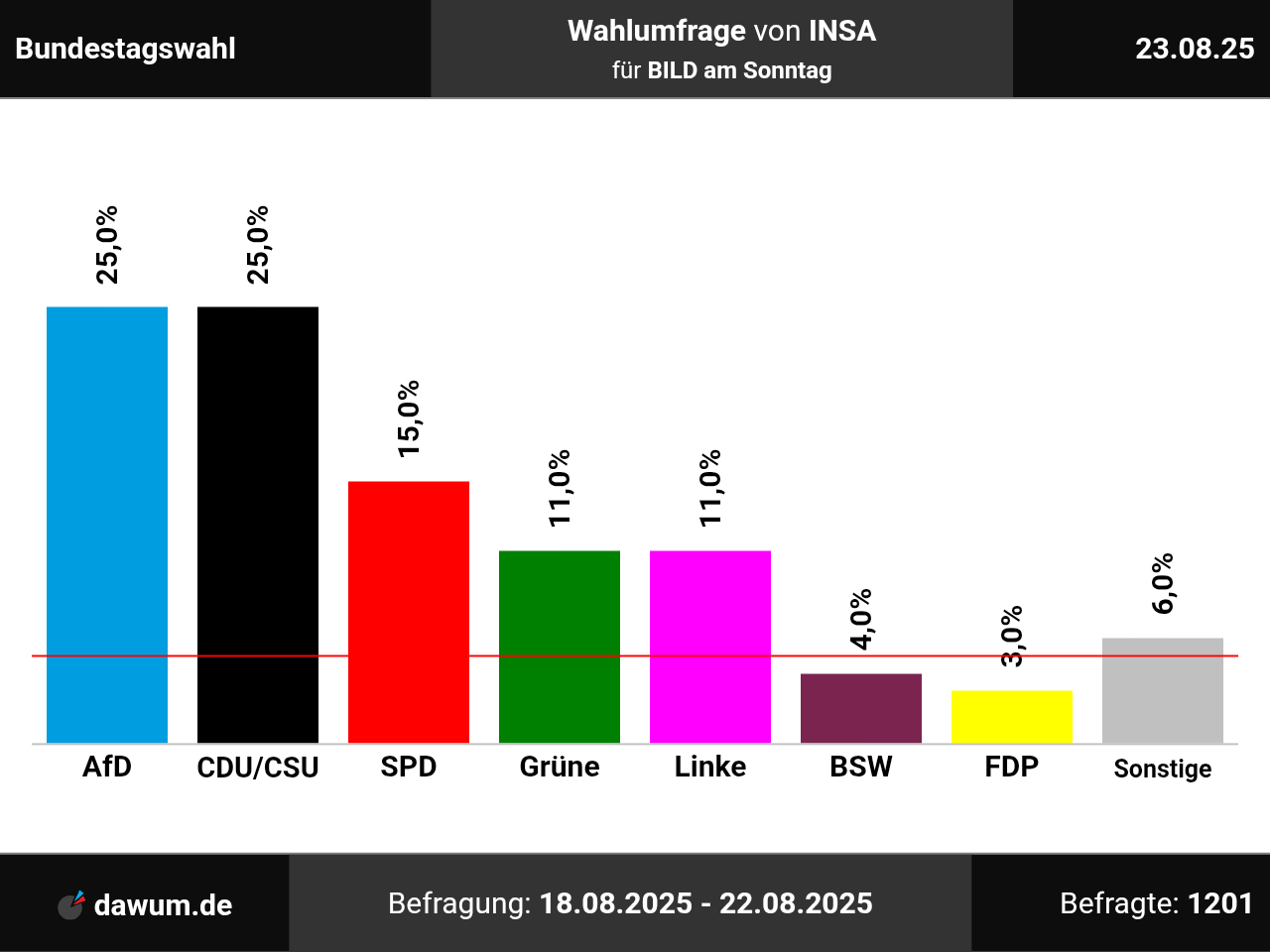 Diese Wahlumfrage (Sonntagsfrage) zur Bundestagswahl wurde von INSA im Auftrag von BILD am Sonntag durchgeführt und am 23.08.2025 insbesondere bei t-online.de und wahlrecht.de veröffentlicht. Die Mixed-Befragung (telefonisch und online) fand zwischen dem 18.08.2025 und dem 22.08.2025 bei 1201 Wahlberechtigten statt.
