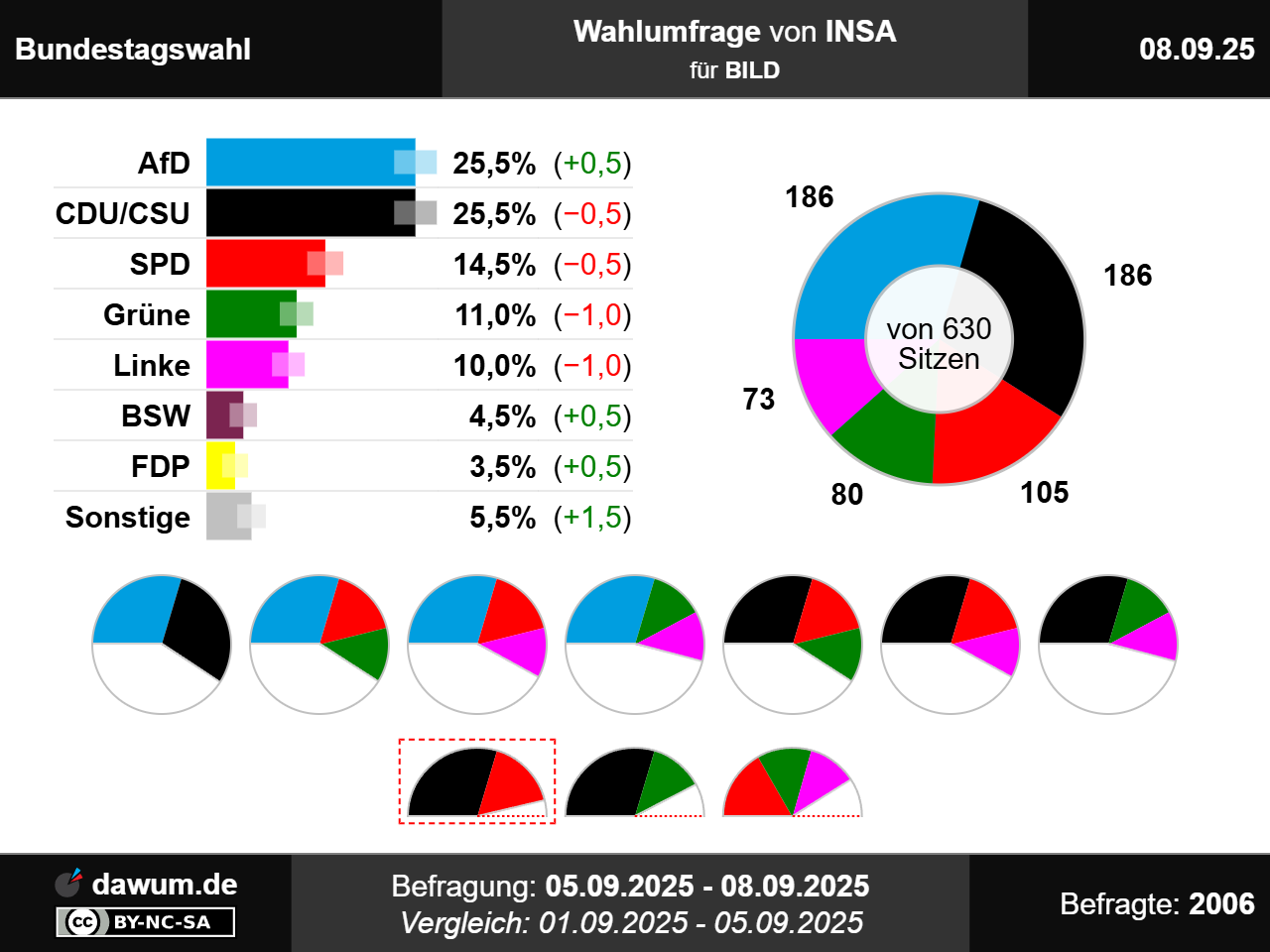 Diese Wahlumfrage (Sonntagsfrage) zur Bundestagswahl wurde von INSA im Auftrag von BILD durchgeführt und am 08.09.2025 insbesondere bei bild.de veröffentlicht. Die Online-Befragung fand zwischen dem 05.09.2025 und dem 08.09.2025 bei 2006 Wahlberechtigten statt.