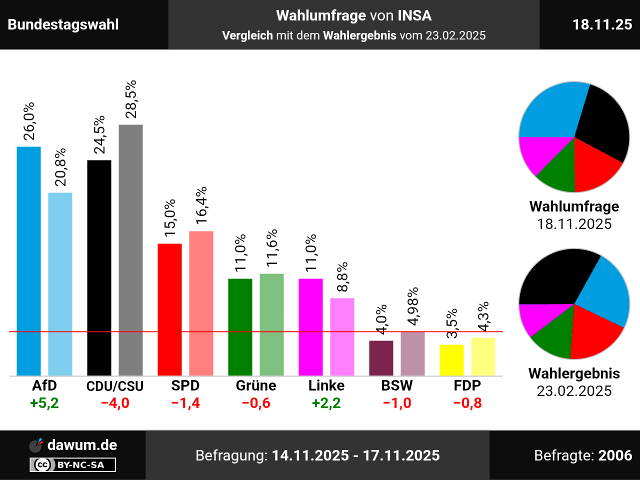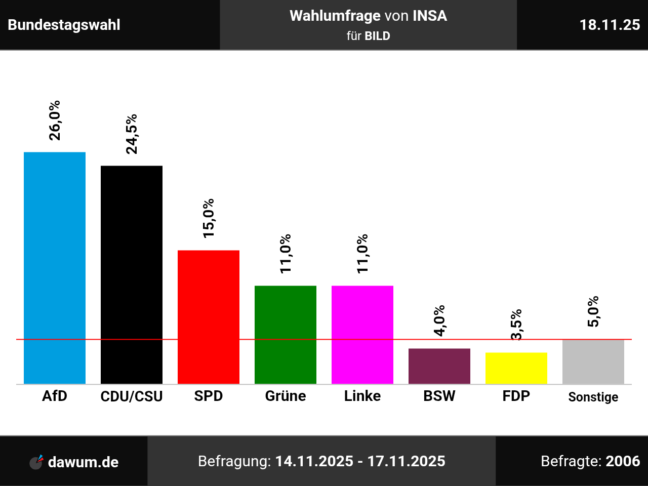 Diese Wahlumfrage (Sonntagsfrage) zur Bundestagswahl wurde von INSA im Auftrag von BILD durchgeführt und am 18.11.2025 insbesondere bei bild.de veröffentlicht. Die Online-Befragung fand zwischen dem 14.11.2025 und dem 17.11.2025 bei 2006 Wahlberechtigten statt.