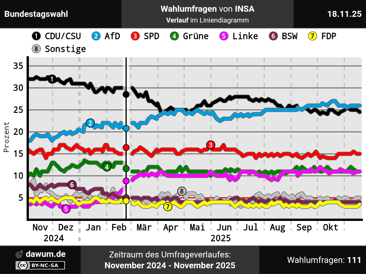 Umfrageverlauf bei INSA von November 2024 bis November 2025