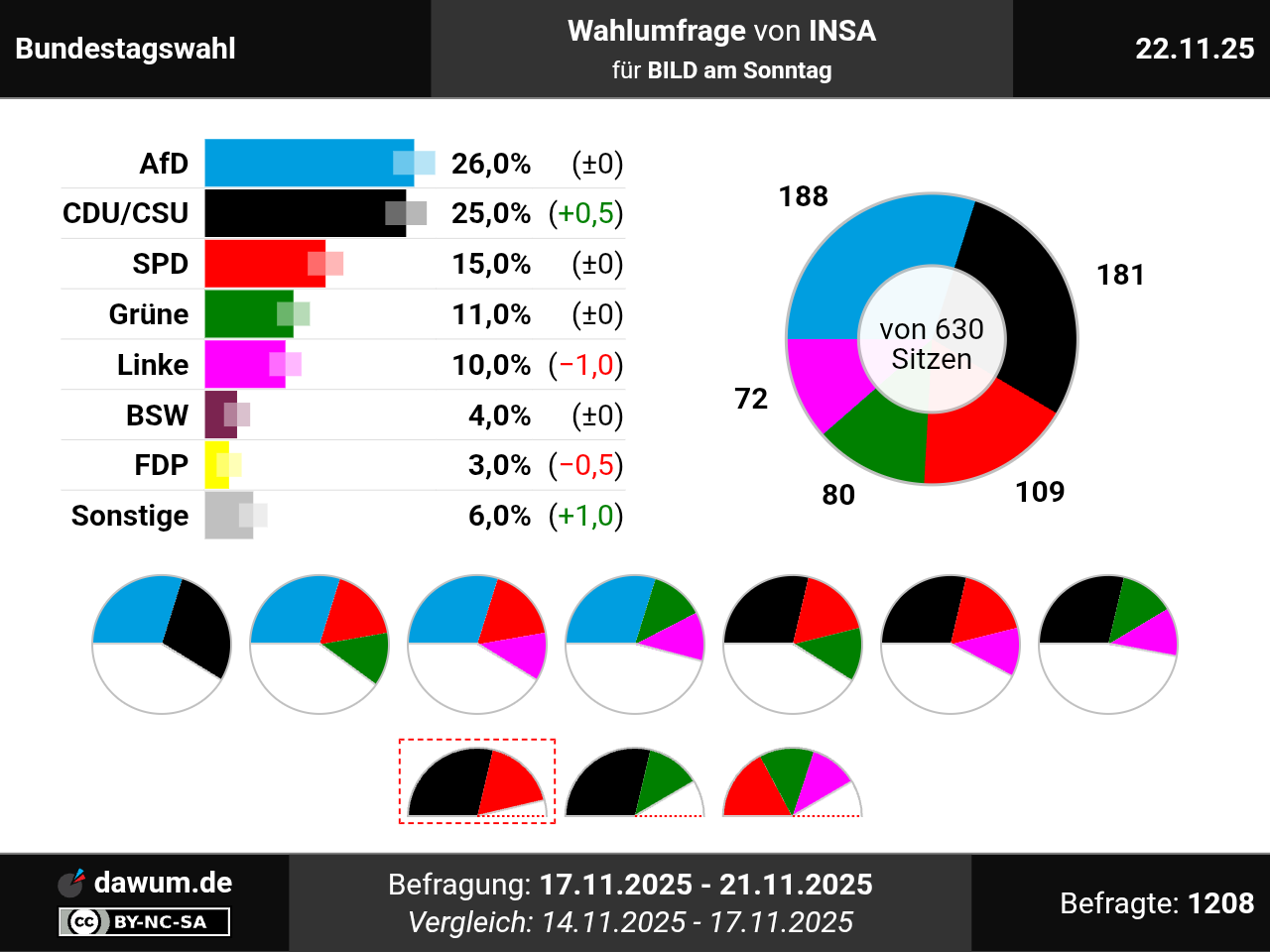Diese Wahlumfrage (Sonntagsfrage) zur Bundestagswahl wurde von INSA im Auftrag von BILD am Sonntag durchgeführt und am 22.11.2025 insbesondere bei bild.de veröffentlicht. Die Mixed-Befragung (telefonisch und online) fand zwischen dem 17.11.2025 und dem 21.11.2025 bei 1208 Wahlberechtigten statt.