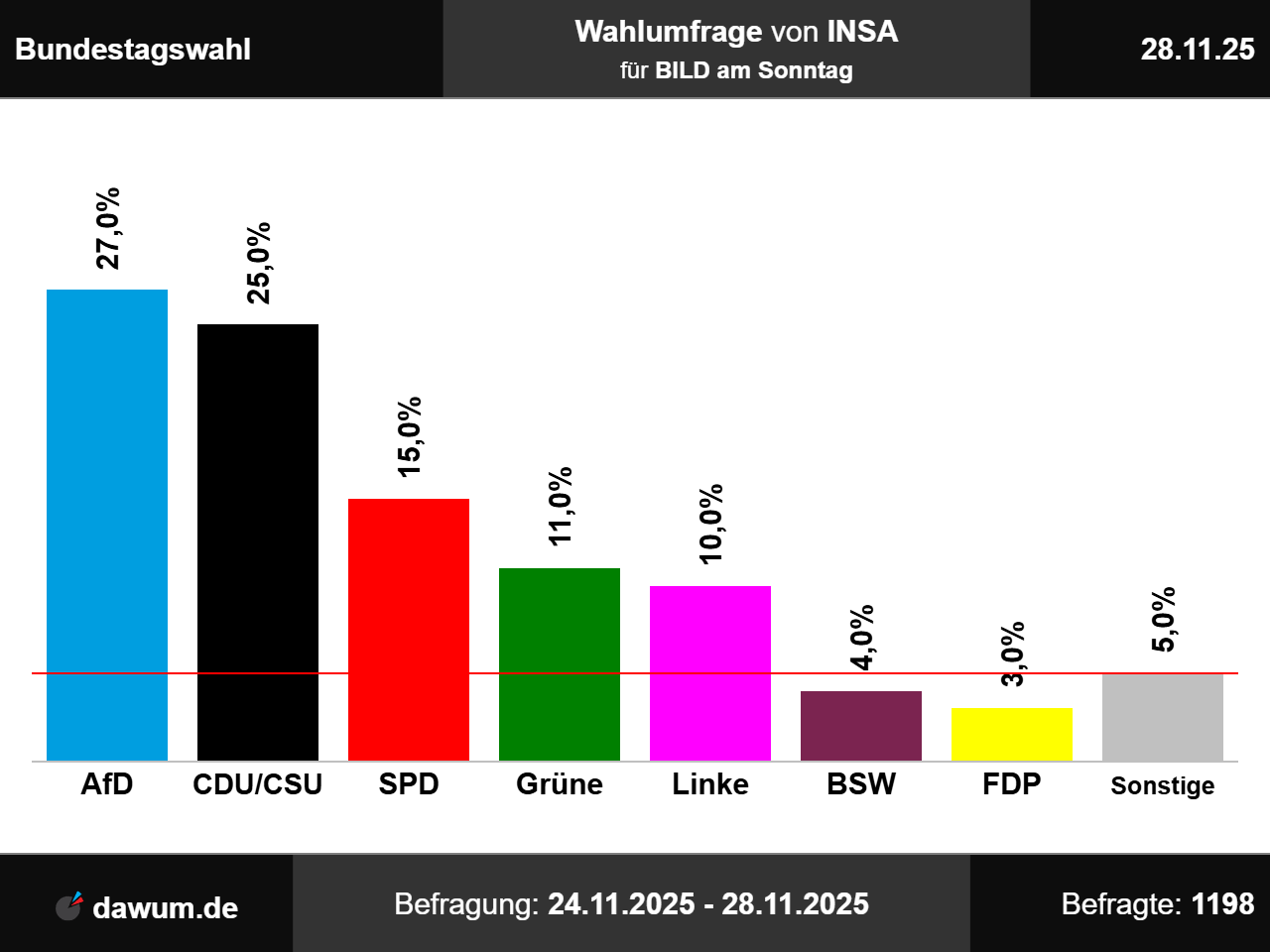 Diese Wahlumfrage (Sonntagsfrage) zur Bundestagswahl wurde von INSA im Auftrag von BILD am Sonntag durchgeführt und am 28.11.2025 insbesondere bei bild.de veröffentlicht. Die Mixed-Befragung (telefonisch und online) fand zwischen dem 24.11.2025 und dem 28.11.2025 bei 1198 Wahlberechtigten statt.