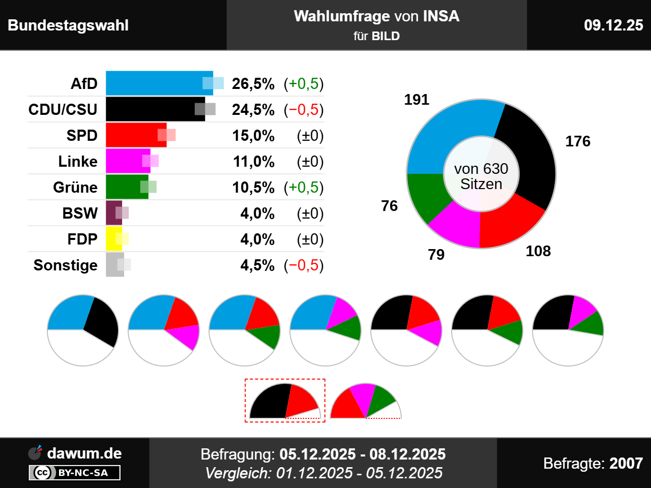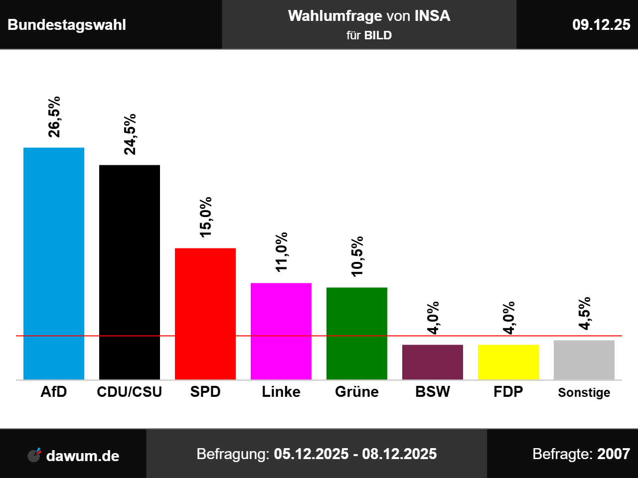 Diese Wahlumfrage (Sonntagsfrage) zur Bundestagswahl wurde von INSA im Auftrag von BILD durchgeführt und am 09.12.2025 insbesondere bei youtube.com veröffentlicht. Die Online-Befragung fand zwischen dem 05.12.2025 und dem 08.12.2025 bei 2007 Wahlberechtigten statt.
