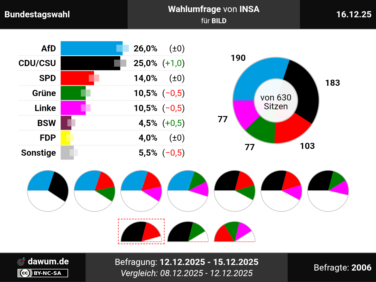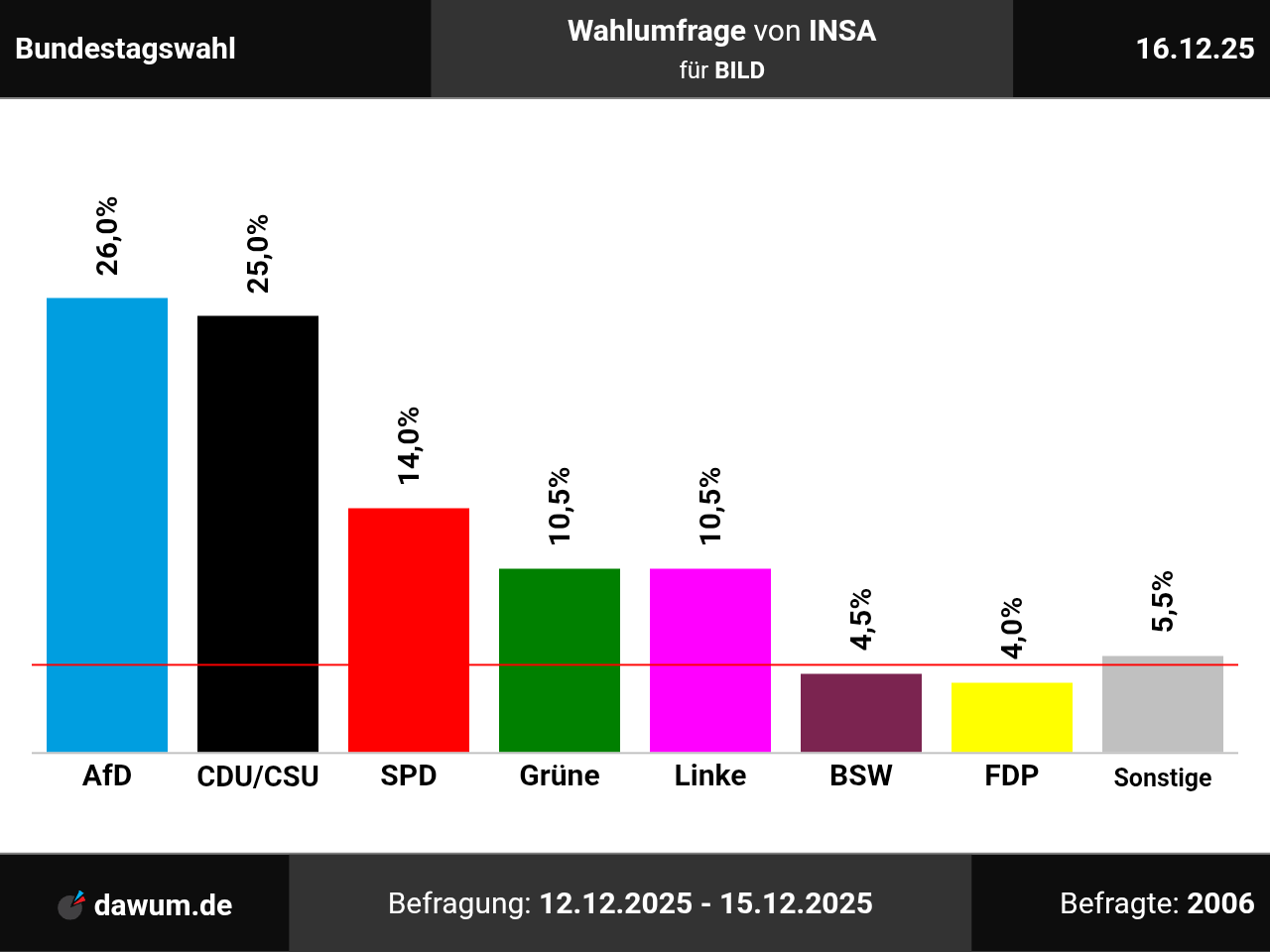 Diese Wahlumfrage (Sonntagsfrage) zur Bundestagswahl wurde von INSA im Auftrag von BILD durchgeführt und am 16.12.2025 insbesondere bei youtube.com veröffentlicht. Die Online-Befragung fand zwischen dem 12.12.2025 und dem 15.12.2025 bei 2006 Wahlberechtigten statt.