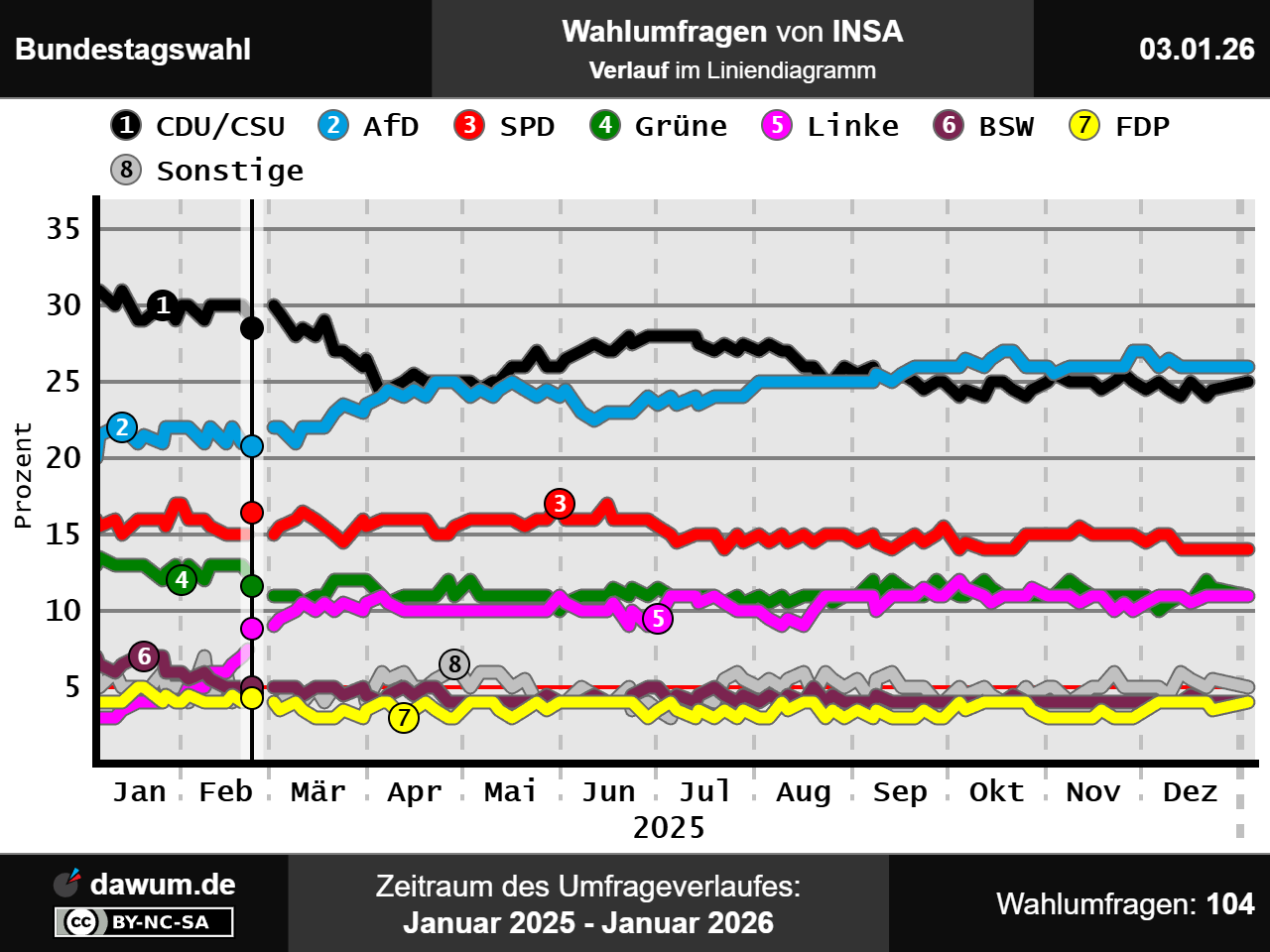 Umfrageverlauf bei INSA von Januar 2025 bis Januar 2026