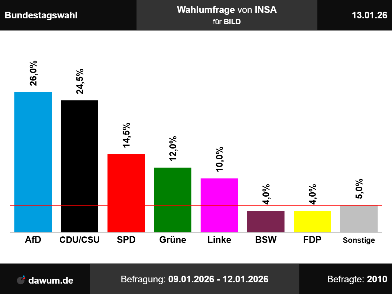 Diese Wahlumfrage (Sonntagsfrage) zur Bundestagswahl wurde von INSA im Auftrag von BILD durchgeführt und am 13.01.2026 insbesondere bei youtube.com veröffentlicht. Die Online-Befragung fand zwischen dem 09.01.2026 und dem 12.01.2026 bei 2010 Wahlberechtigten statt.