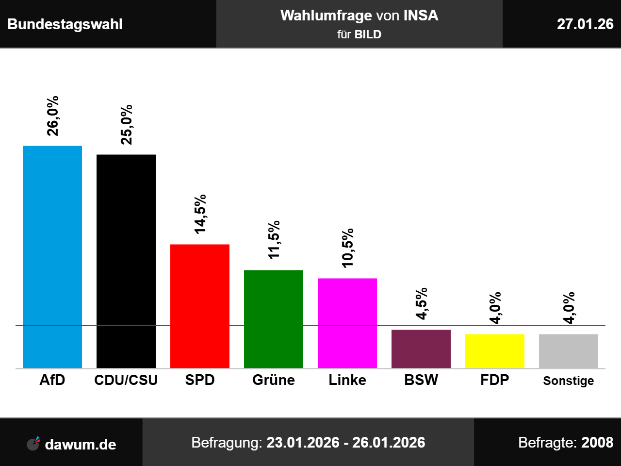 Diese Wahlumfrage (Sonntagsfrage) zur Bundestagswahl wurde von INSA im Auftrag von BILD durchgeführt und am 27.01.2026 insbesondere bei youtube.com veröffentlicht. Die Online-Befragung fand zwischen dem 23.01.2026 und dem 26.01.2026 bei 2008 Wahlberechtigten statt.