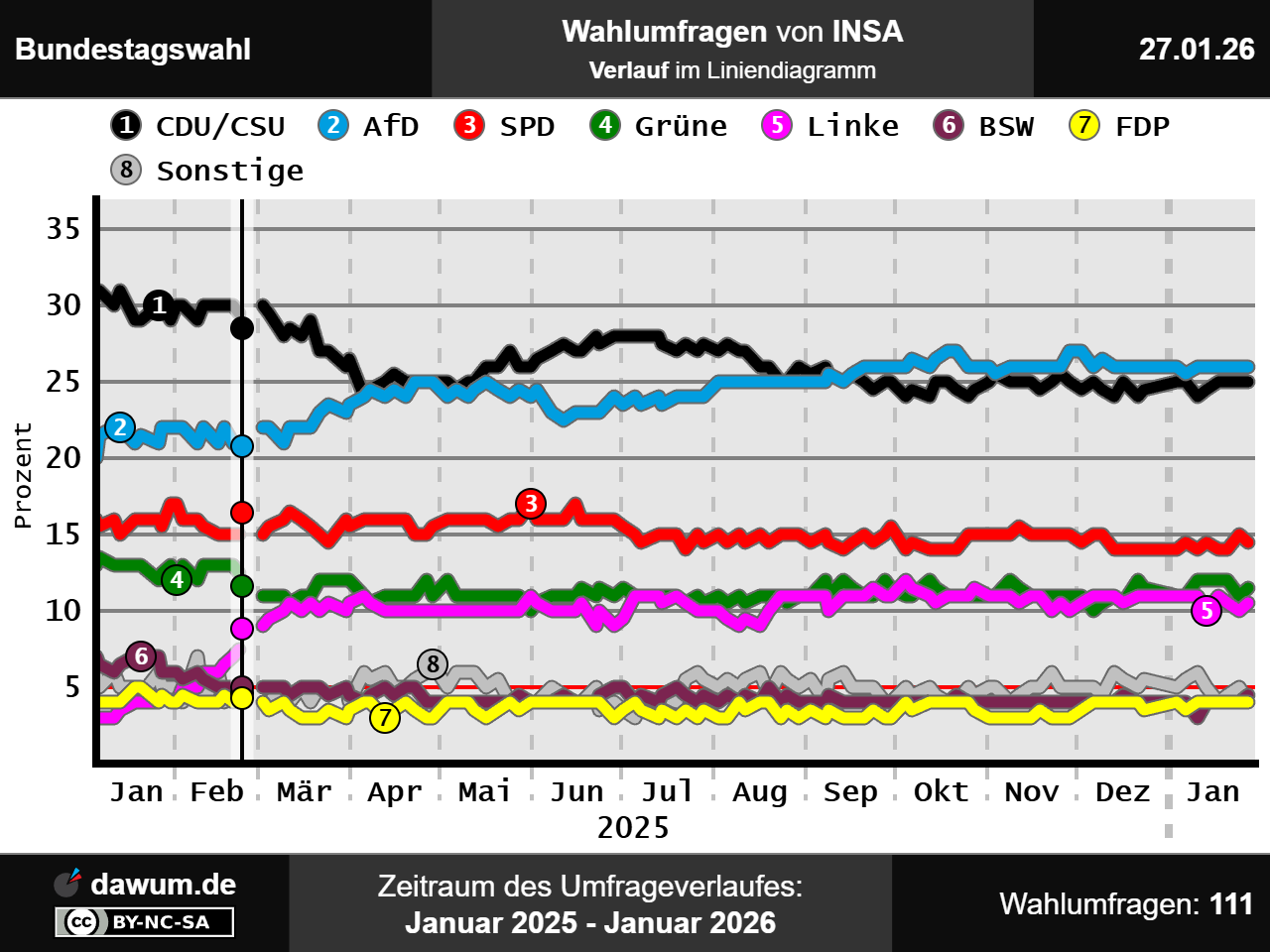 Umfrageverlauf bei INSA von Januar 2025 bis Januar 2026